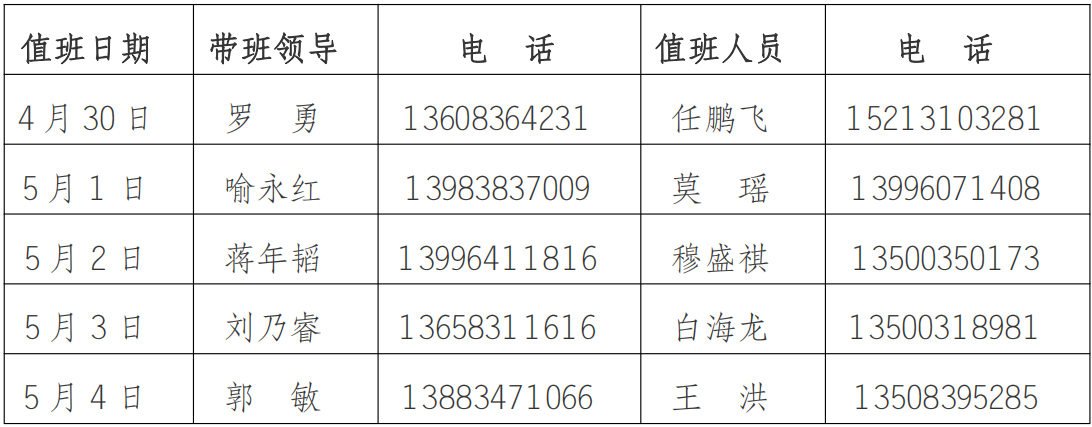 为更好地服务全校师生,保障五一劳动节期间学校相关工作顺利开展,党政办公室每天均安排值班人员,负责学校校章、党委印章、法人印章、学校合同章、党政办公室印章等用印,学校介绍信开具,公文签发审核,会议室申请及使用等工作,请需求单位或师生按规定流程履行签批手续,其他未尽事宜,请与值班老师联系。