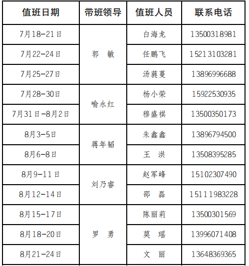 为更好地服务全校师生,保障暑假期间学校相关工作顺利开展,党政办公室每天均安排值班人员,负责学校校章、党委印章、法人印章、学校合同章、党政办公室印章等用印,学校介绍信开具,公文签发审核,会议室申请及使用等工作,请需求单位或师生按规定流程履行签批手续,其他未尽事宜,请与值班老师联系。
