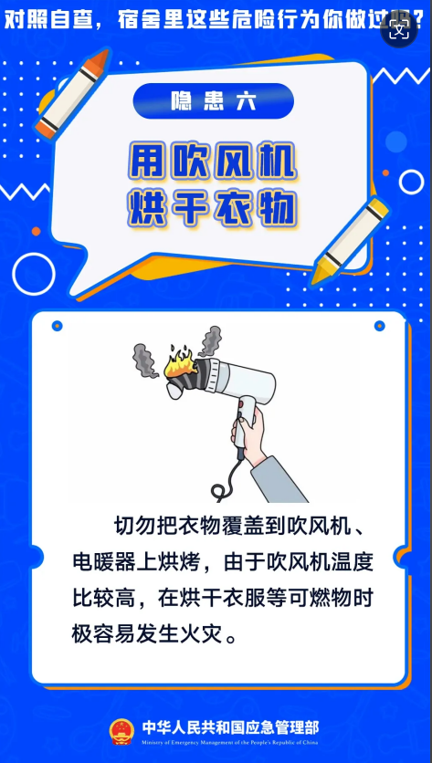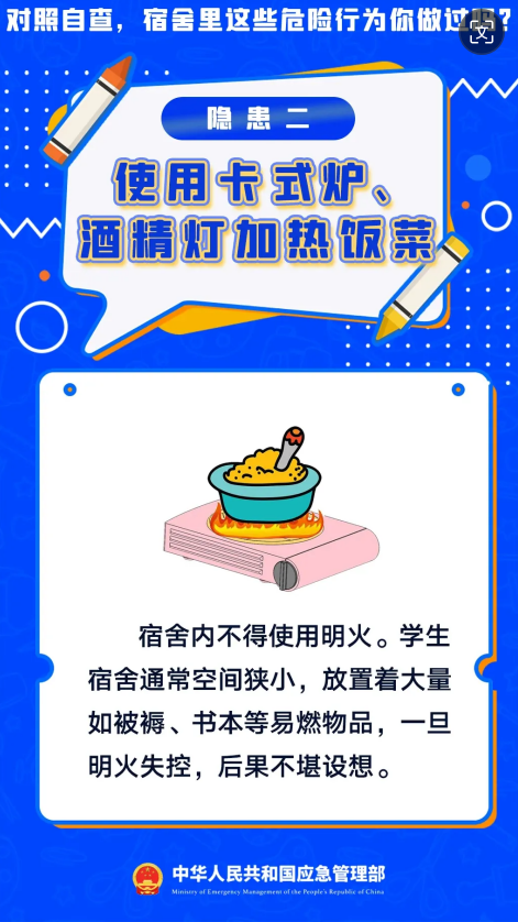 暑假假期正式结束,新学期开学啦。开学第一课,先学安全课,学校作为人员密集场所消防安全尤为重要,宿舍可燃物多且用电量大,一旦发生火灾后果不堪设想,用电饭煲做饭、使用劣质充电宝………对照自查宿舍里这些危险行为你做过吗?