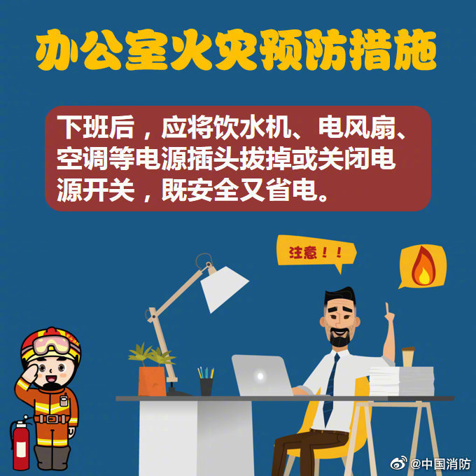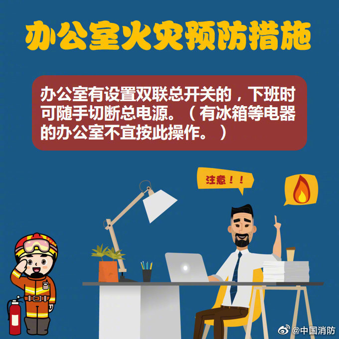 办公室是人员密集场所,电器设备较多,电脑、空调、打印机全都集中在这里。这些设备每天都在不停地运转,给办公室的用电量带来极大的负担。因此,一定要重视办公室的消防安全,定期排查隐患,防患于未“燃”。