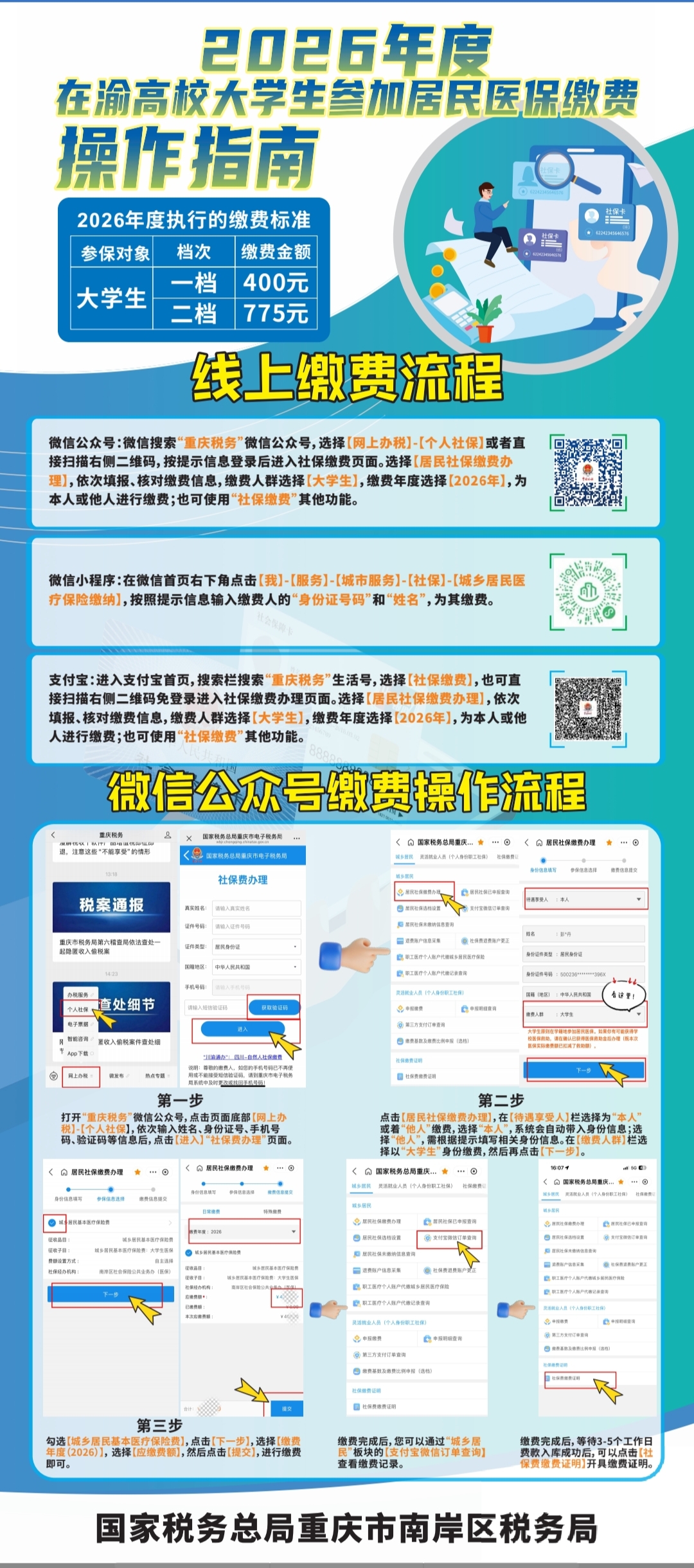 (一)普通大学生参保缴费流程(详见附件2:2026年度在渝高校大学生参加居民医保缴费操作指南):