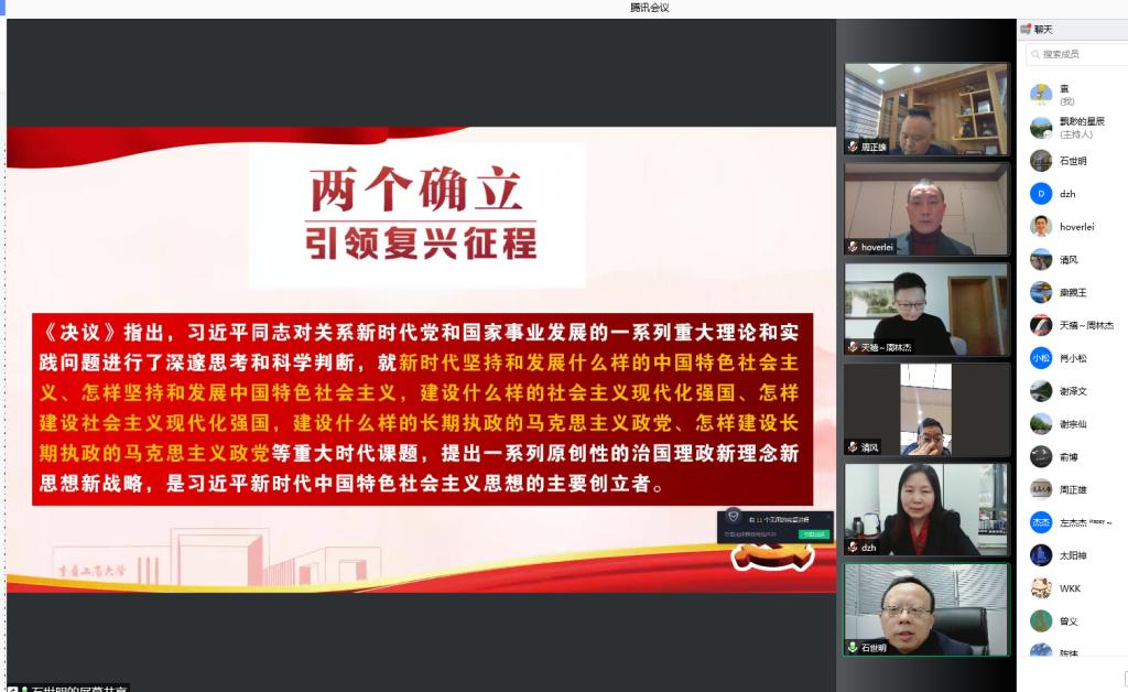 石世明聚焦学习党的十九届六中全会精神,结合自己的学习体会,重点对党领导人民取得的四个“伟大成就”、两个“确立”、中国共产党百年奋斗的“五大”历史意义做了领学,鼓励校友建功新时代。