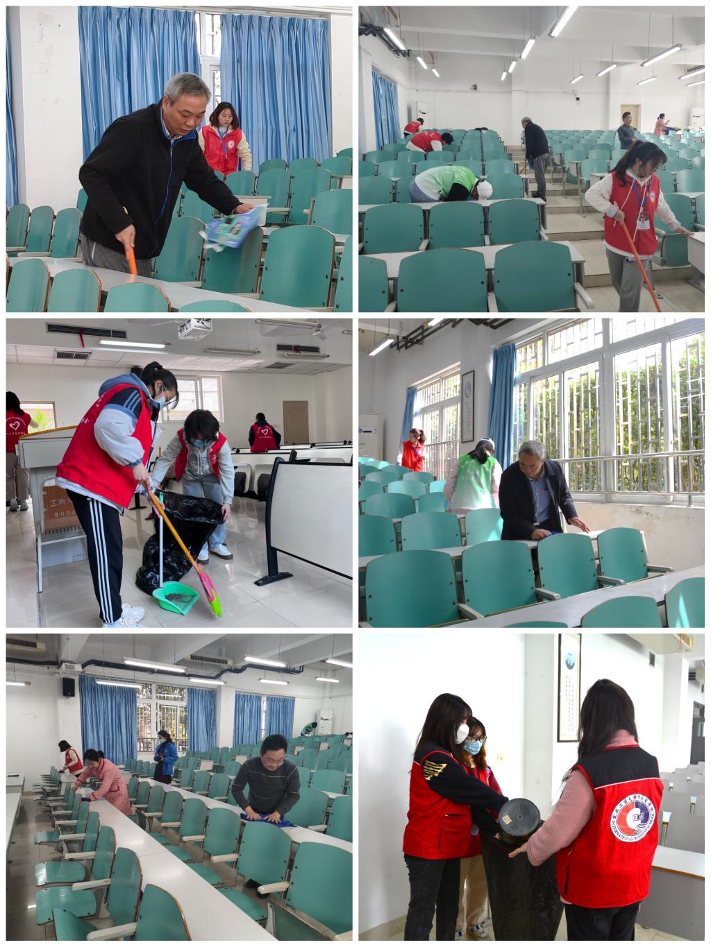 启动仪式后,志愿者们来到教学区、宿舍区一同进行清洁和洒扫。大家认真的对教室的地面、桌椅、黑板、门窗,对宿舍的公共区域进行打扫,对卫生死角进行清理,垃圾倾倒。此次活动,共清扫南岸校区、江北校区、兰花湖片区教室156间、宿舍6栋以及图书馆区域。