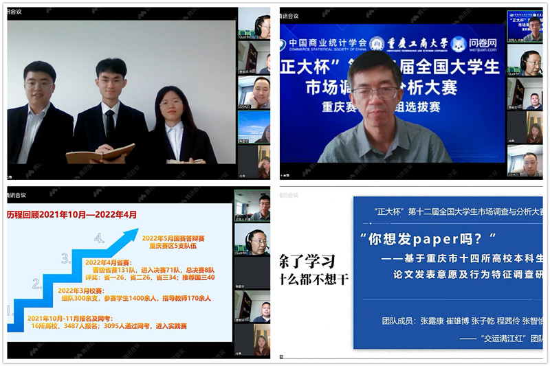 由中国商业统计学会主办的“正大杯”第十二届全国大学生市场调查与分析大赛重庆赛区本科组选拔赛于4月23日在安博app官网登录_安博anbo(中国)成功举行。本次大赛自2021年10月正式启动,经过6个多月的专业培训、知识赛网考及校赛选拔,最终来自市内16所高校的131支团队进入赛区选拔赛。