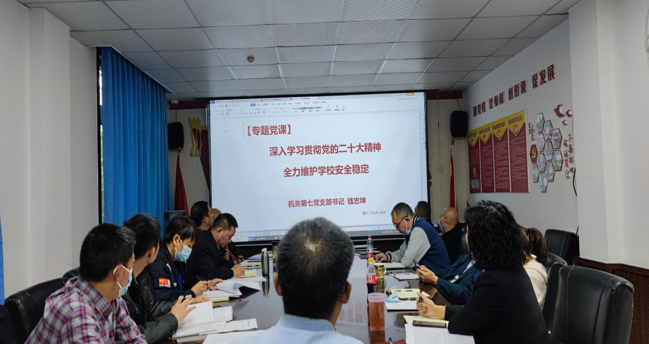 10月16日,中国共产党第二十次全国代表大会隆重开幕,机关七支部把学习宣传贯彻党的二十大精神作为重中之重,以高度的责任感、使命感抓好党的二十大精神学习宣传贯彻,同时以党的二十大精神作为指导,以实际行动推动校园安稳工作迈上新台阶。