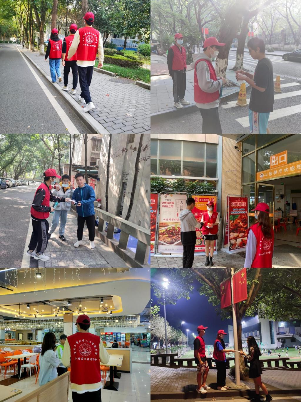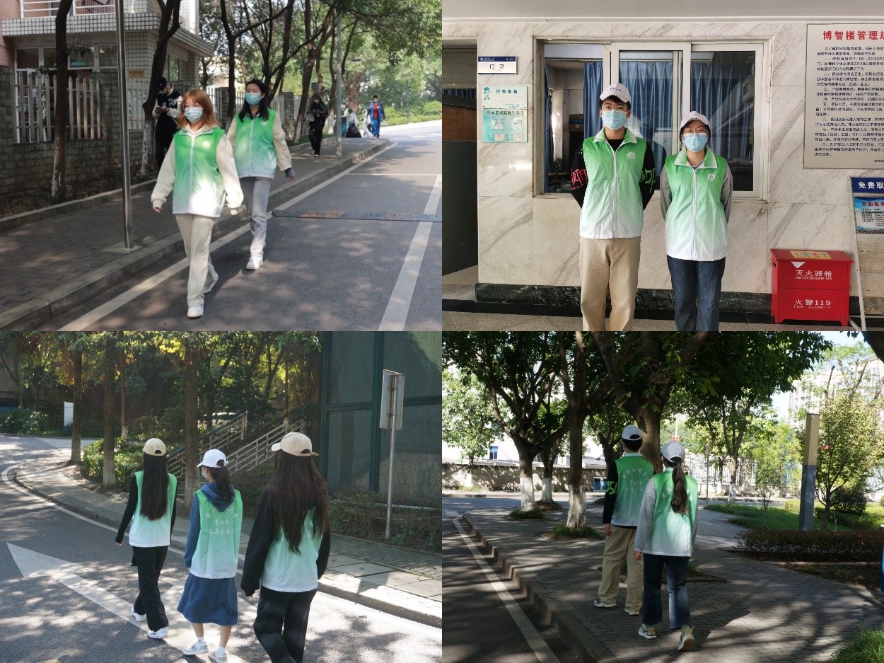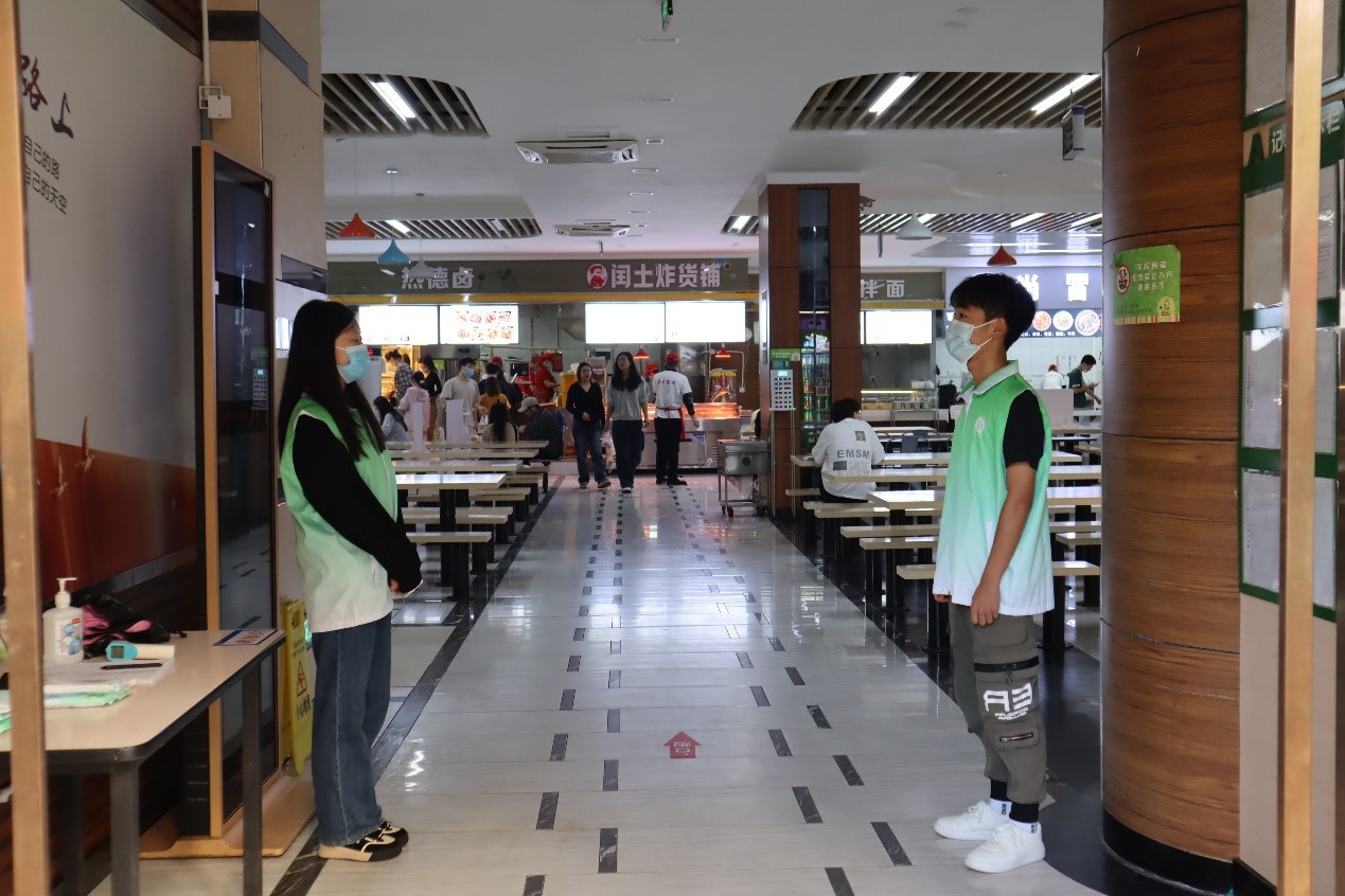 “疫情就是命令,防控就是责任。”每天早上8点,校园巡逻的志愿者们到指定地点领取“翠小青”志愿者马甲,开始在校园巡逻起来。从南操到南区,从七教到图书馆,从八教到田家炳,从北操到翠湖,4个小分队各司其职,关注校园安全,提醒同学们正确佩戴口罩,减少人员聚集。从早上8点到晚上9点,一共6个班次的轮换,大家都有序交接认真工作,绝不马虎。午餐和晚餐的时间,筱园、松园、菊园、兰园食堂的大门口和各个楼层,志愿者也陆续到岗,他们拿上喊话器,提醒师生佩戴好口罩,间隔1米,有序取餐。他们精神饱满,热情用心。志愿者们说,我们能做的不多,能做一点算一点,校园需要大家的共同守护。