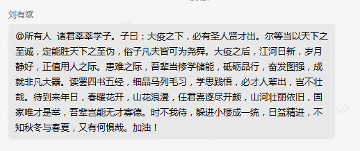 还有辅导员,有感而发,用自己创作的诗文激励同学们克服困难,团结战疫。