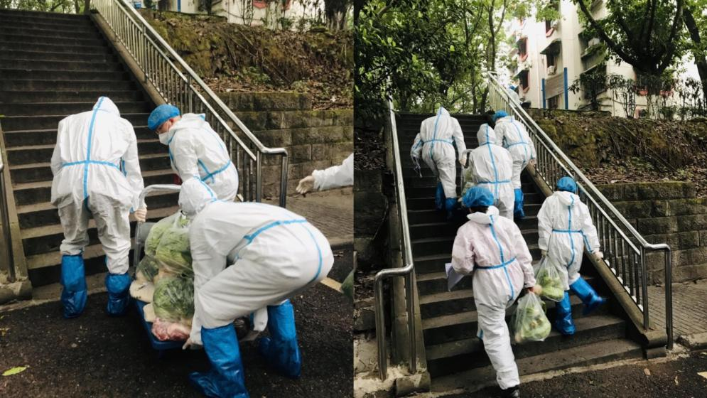杜朝辉、刘勇、周浩正在南岸校区家属区送蔬菜