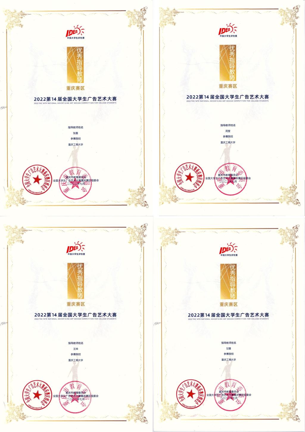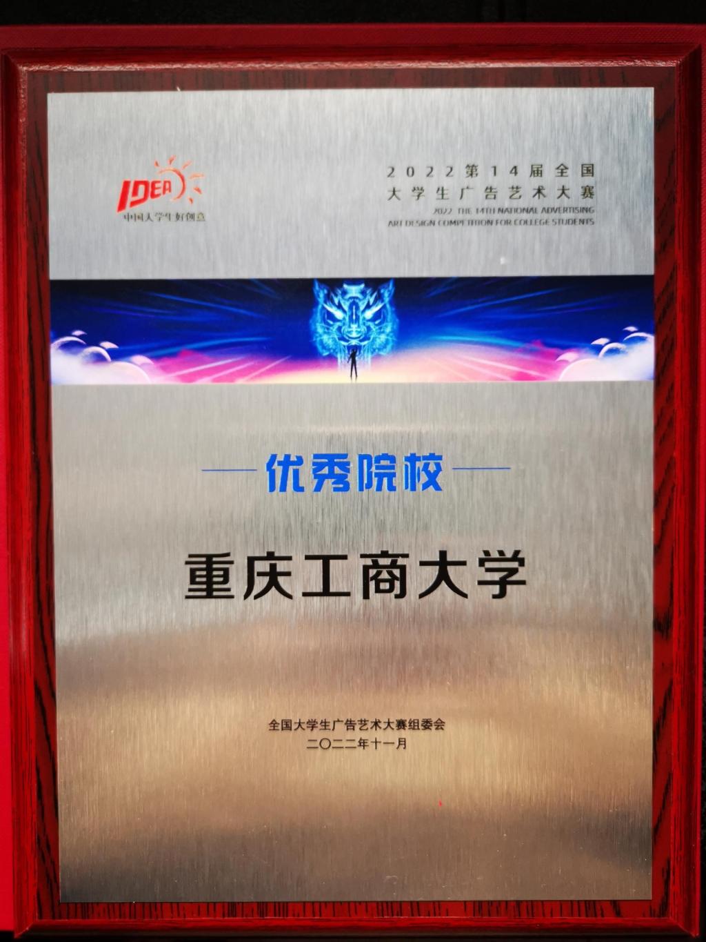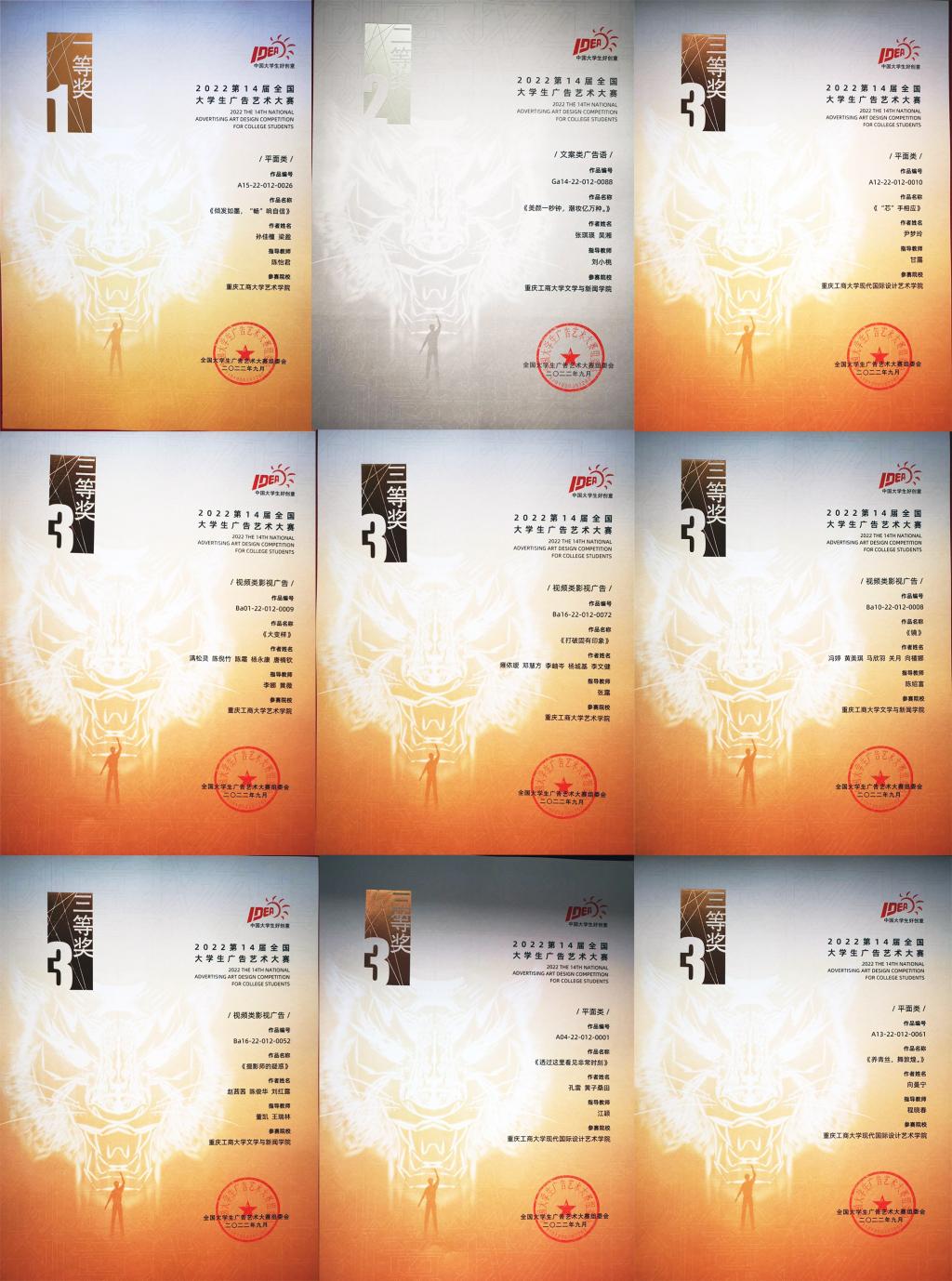 在日前成功闭幕的第十四届全国大学生广告艺术大赛上,我校学生参赛作品获全国赛区一等奖1项、二等奖1项、三等奖7项、优秀奖23项;重庆赛区一等奖1项、二等奖6项、三等奖32项、优秀奖181项。学校获评优秀院校。张露、周莹、王烨、甘露等4名老师获重庆赛区优秀指导教师。
