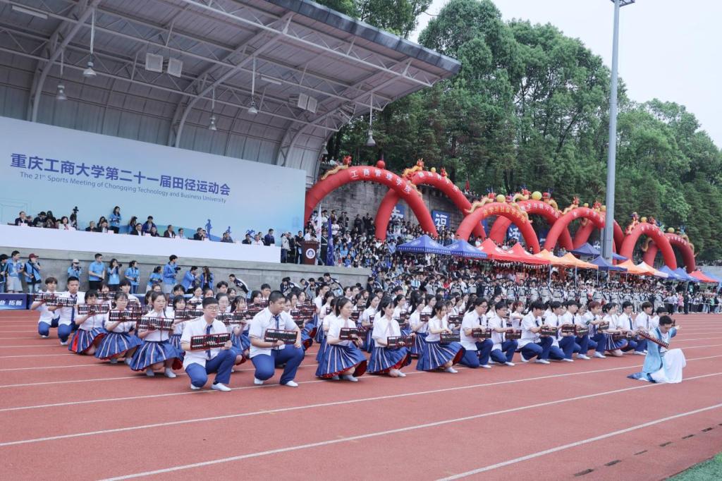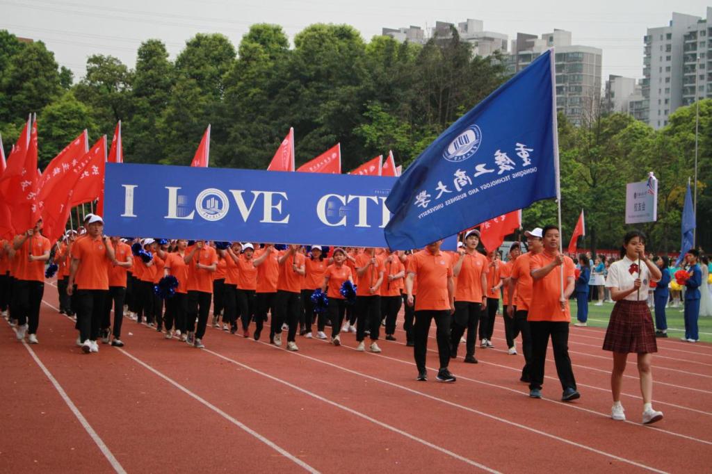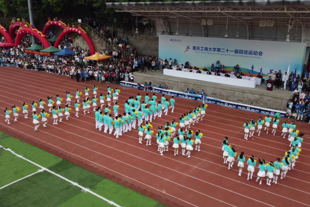 通识学院带来百人啦啦操《青春追梦人》。他们手上花球翻转,脸上洋溢着自信的笑容,用音符跳出青春的旋律,将舞步融入追寻的梦想,随着队形的变换,跑道上出现“CTBU”的字样,释放出了重工商大学子的青春能量。