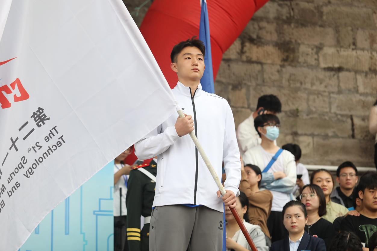 通识学院2022级工商管理类二班的周文烨同学担任本次运动会的会旗旗手,并在主席台就位。