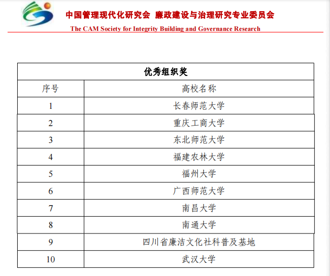 近日,中国管理现代化研究会廉政建设与治理研究专业委员会公布了2022年12.9全国大学生廉洁教育月优秀组织奖获奖高校名单,我校荣列其中。