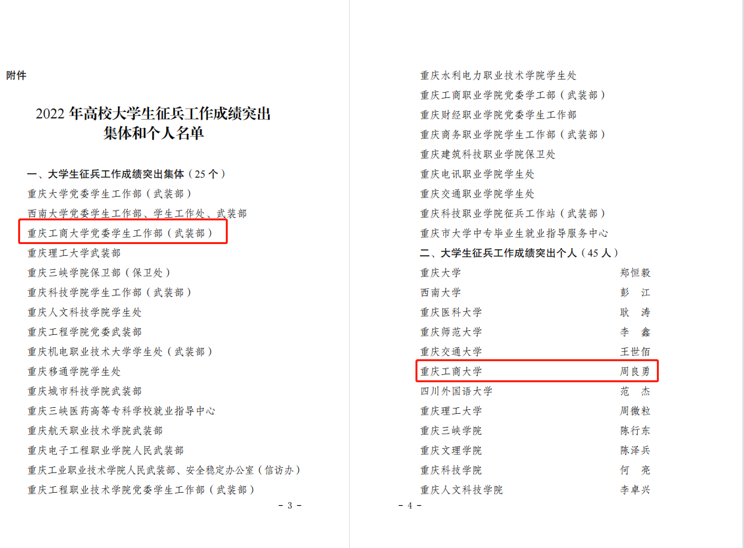 近日,重庆市教育委员会发布《关于2022年普通高校学生管理工作成绩突出集体和个人的通报》(渝教学函〔2023〕14号)和《关于2022年高校大学生征兵工作成绩突出集体和个人的通报》(渝教学函〔2023〕19号)。我校学生处获评“学生日常管理工作成绩突出集体”,白文静同志获评“学生日常管理工作成绩突出个人”;党委学工部(武装部)获评“大学生征兵工作成绩突出集体”,周良勇同志获评“大学生征兵工作成绩突出个人”。