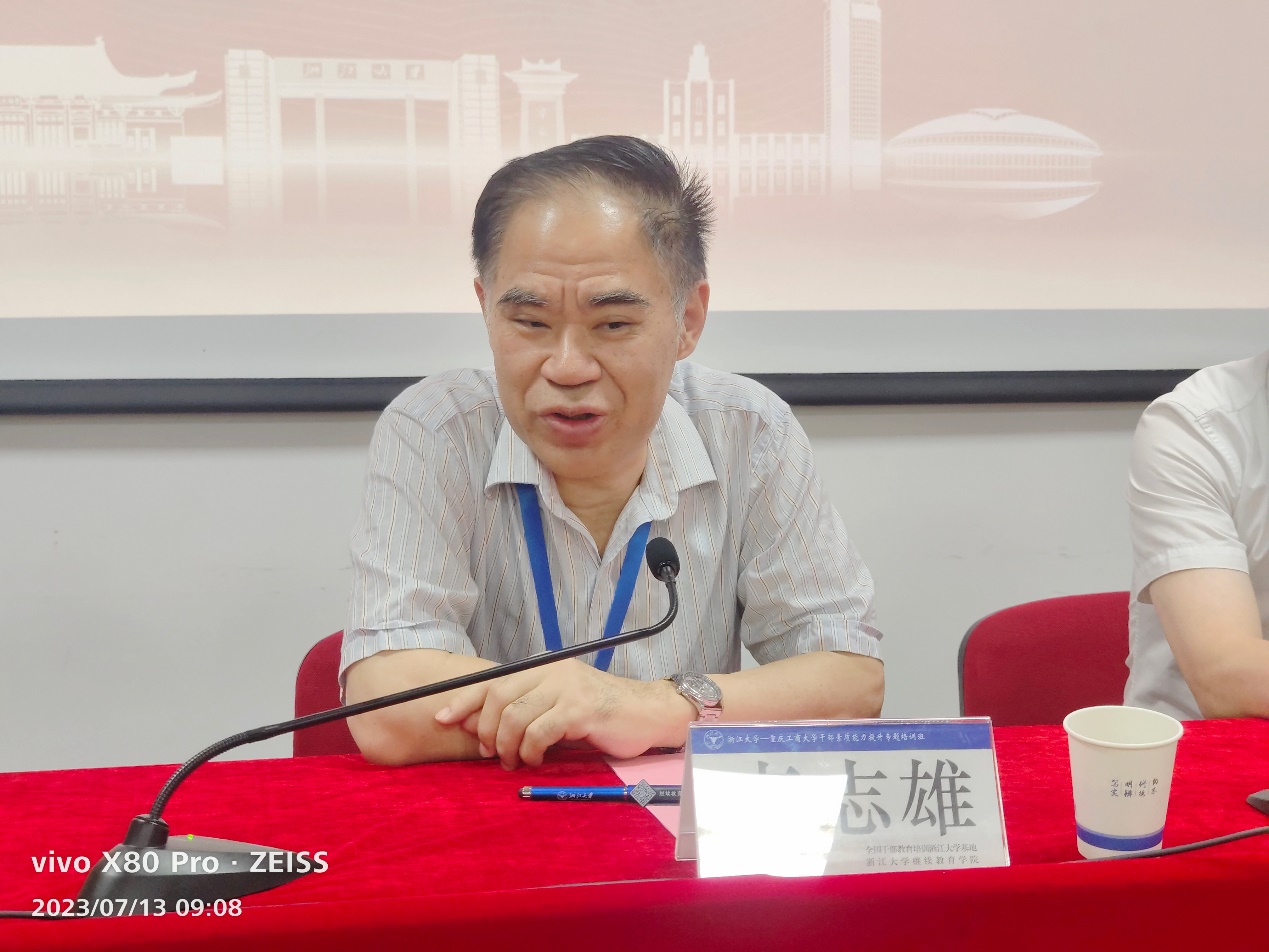7月13日上午,培训班开班式在浙江大学华家池校区举行,全国干部教育培训浙江大学基地副主任、浙江大学继续教育学院党委副书记兼副院长钟永萍,我校党委书记李志雄出席开班式。