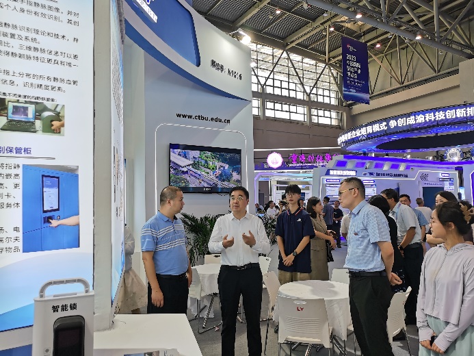 市委教育工委书记、市教委主任刘宴兵带队莅临学校展区参观指导,校长温涛接待了刘宴兵主任一行,并详细介绍了学校在静脉识别、废油资源化、智能网联汽车领域的科技进展情况。市委教育工委委员、市教委副主任蒋云芳陪同参观。