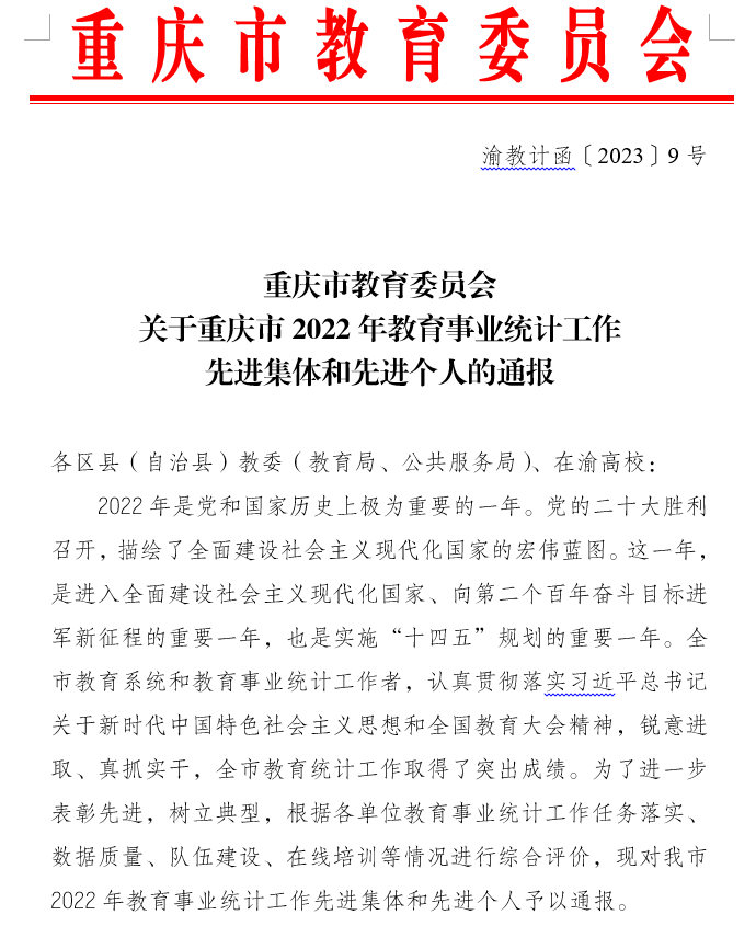 近日,重庆市教育委员会公布了《关于重庆市2022年教育事业统计工作先进集体和先进个人的通报》,我校被评为重庆市2022年教育事业统计工作先进集体,学校党政办任鹏飞同志荣获重庆市教育事业统计工作先进个人。