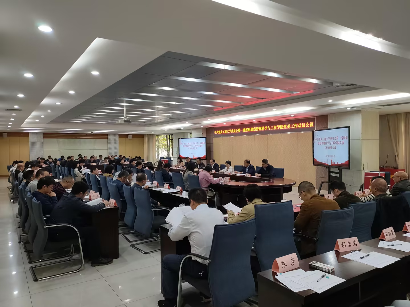 会上,被巡察党组织参会人员填写了调查问卷和民主测评表。党委巡察办专职副主任(正处级)喻永红,机关党委书记、组织部副部长王建明,纪检监察室副主任苏治远,党委巡察办巡察科科长文丽,两个巡察组全体干部,管理科学与工程学院和法学与社会学学院领导班子成员、党支部书记、内设科室负责人、教职工党员代表、师生代表等分别参加了会议。