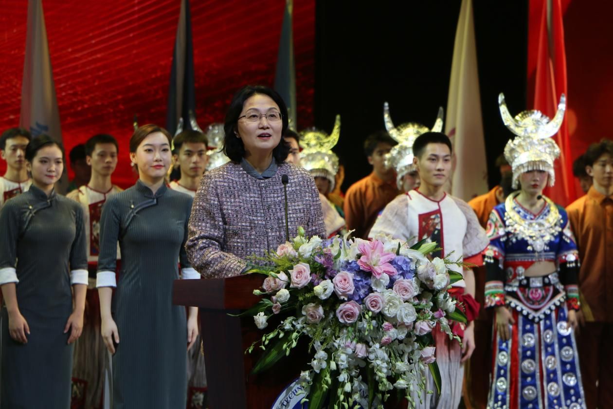 金玲在讲话中向出席开幕式的领导、来宾,老师们、同学们表示热烈的欢迎;向为本次活动给予大力支持的相关高校表示衷心感谢;向入选参加市级现场集中展演的学校和师生们表示热烈祝贺。她谈到,党的二十大报告指出,培养造就大批德才兼备的高素质人才,是国家和民族长远发展大计。习近平总书记强调,“做好美育工作,要坚持立德树人,扎根时代生活,遵循美育特点,弘扬中华美育精神,让祖国青年一代身心都健康成长。”近年来在市委市政府的坚强领导下,市教委全面贯彻中共中央办公厅、国务院办公厅《关于全面加强和改进新时代学校美育工作的意见》,自觉落实立德树人的根本任务,深化五育并举,培根铸魂,坚持把学校美育作为落实立德树人根本任务的重要途径,作为传承创新中华优秀传统文化的重要载体,着力抓改革、优评价、研课程、深融合、搭平台、强引领,涌现出一大批具有时代特征、学校特色、学生特点、教育特质和重庆辨识度、全国影响力的学校美育实践品牌,唱响了立德树人主旋律,奏响了协同育人的交响乐。她谈到,本届参演作品呈现出主题鲜明、形式多样、内容丰富的特点,既充分展现了我市高校美育工作取得的丰硕成果,更充分彰显了我市当代大学生生机蓬勃,积极向上的良好精神风貌。她希望参赛选手们在比赛中用青春和活力演绎属于自己的才艺和风采,共同把本届活动办成秩序井然、精彩热烈、充满朝气的艺术盛会。她期望全市各高校、各区县更加重视美育工作,始终坚持正确方向,坚持改革创新,不断完善美育体系,提高学生的人文素养,培养德智体美劳全面发展的高素质人才,为新时代、新征程、新重庆建设提供强大的人才支撑和智力支持。随后,金玲宣布重庆市第七届大学生艺术展演活动开幕。
