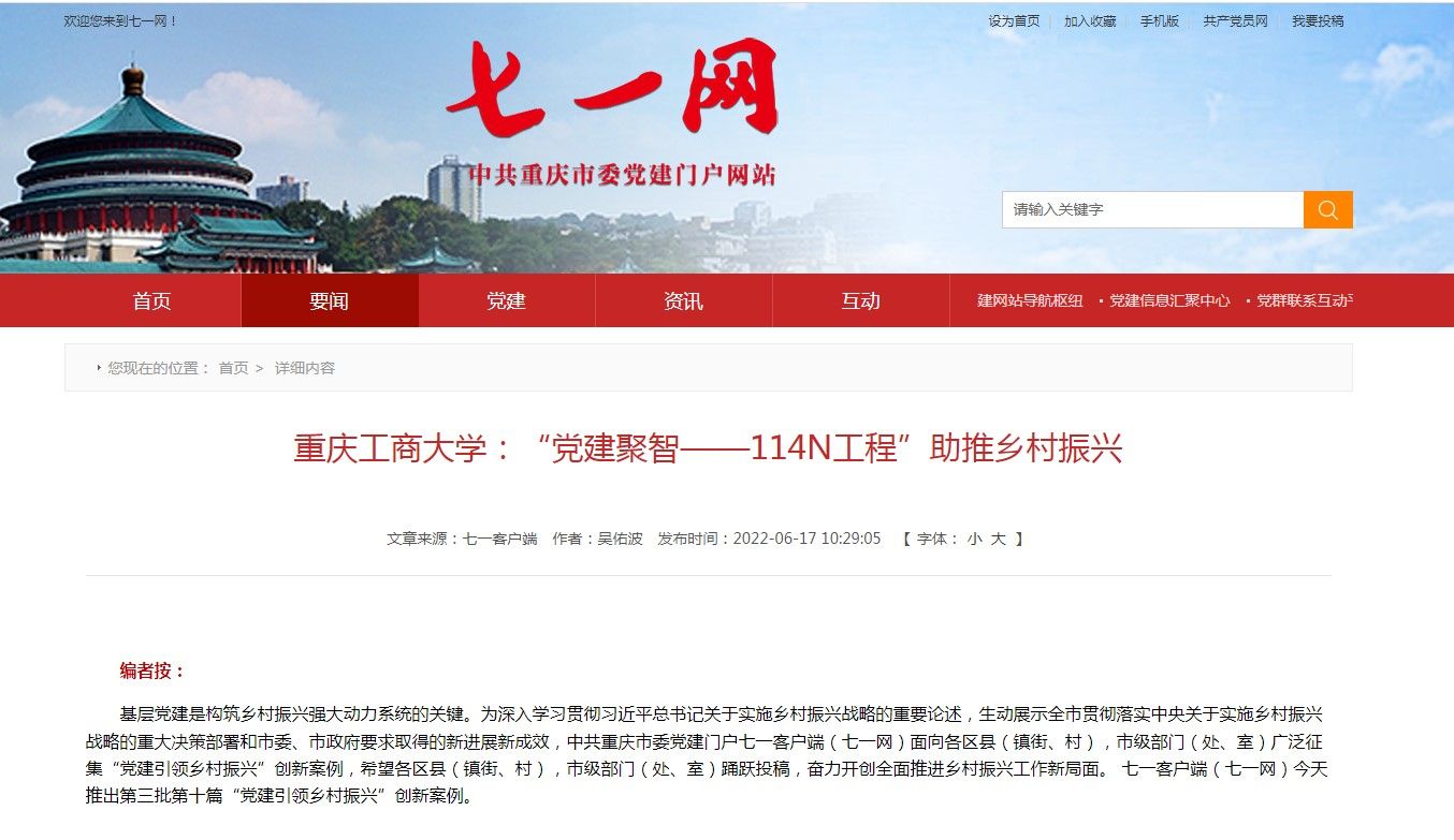 近日,市委教育工委公布了2022年度重庆市高校党建“十大新闻”评选结果,我校党建新闻《安博app官网登录_安博anbo(中国):“党建聚智——114N工程”助推乡村振兴》成功入选。