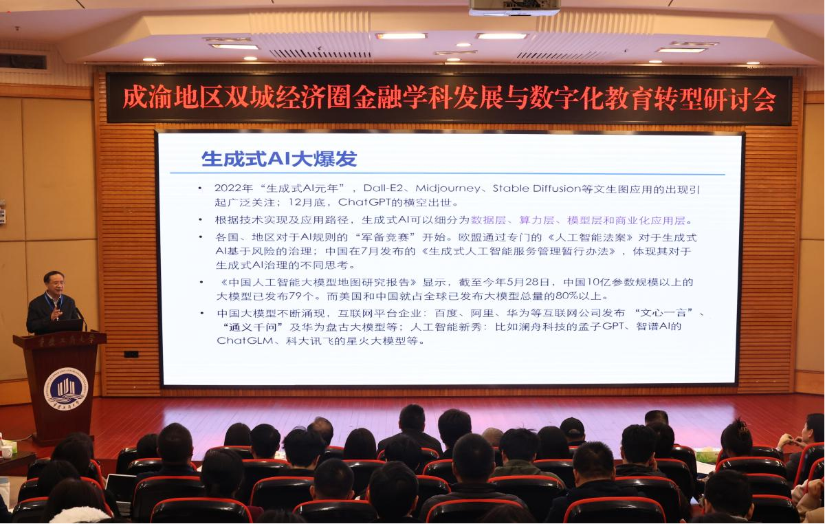 四川农业大学经济学院院长蒋远胜教授以《人工智能与金融教学和研究》为题演讲,梳理人工智能对金融学专业教学和金融经济学研究的影响,指出经济学类专业教学和研究要加强同人工智能的跨学科融合研究,促进学科发展。