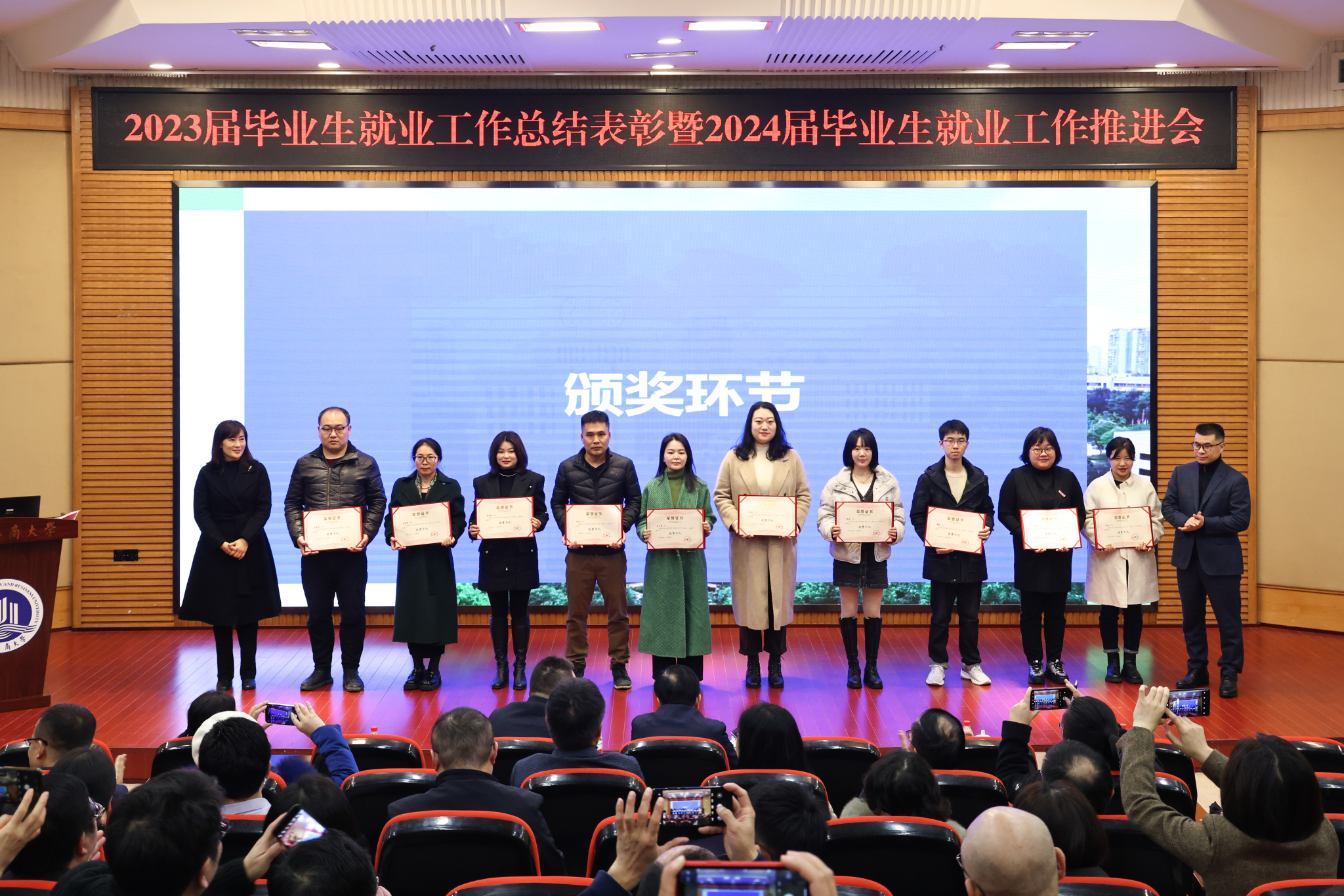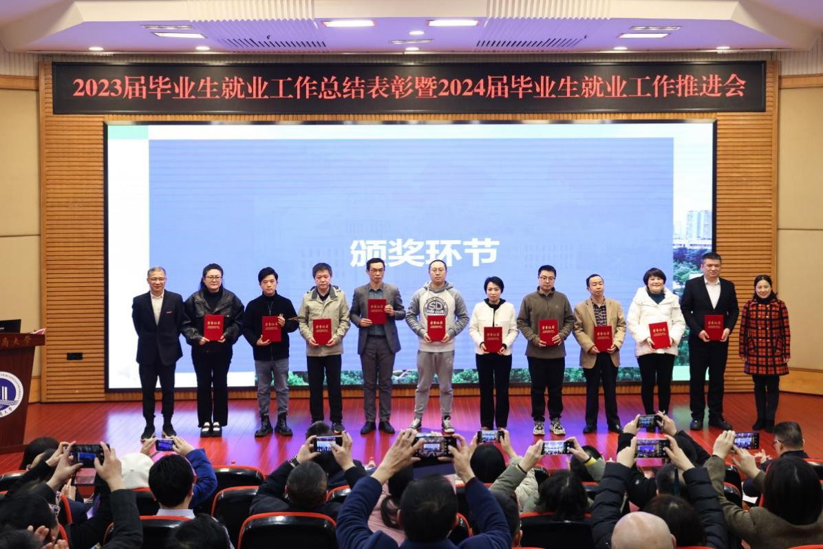 陈运超宣读了安博app官网登录_安博anbo(中国)《关于表彰2023届本科毕业生就业工作先进集体、优秀个人的决定》。陈运超、柏群为获得“就业工作优秀个人”的毕业班辅导员、就业工作联络员颁奖;李敬、张海燕为获得“就业工作优秀个人”的专任教师颁奖;温涛为获得“就业工作优秀个人”的中层干部颁奖;曾维伦为体育学院、环境与资源学院、金融学院、公共管理学院、经济学院、外国语学院6个荣获2023届本科毕业生就业工作先进集体的学院颁奖。
