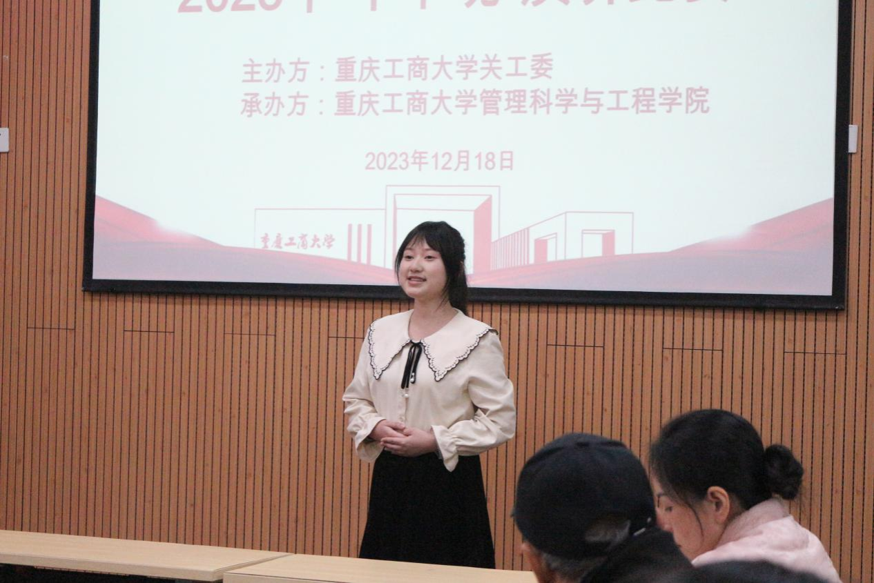经过各学院和主办单位的初赛选拔,共有19位选手进入决赛,学校党委组织部副部长、机关党委书记王建明,校关工委副秘书长兼办公室主任罗卫,党委学生工作部副部长谭彩荷,党委离退休工作部副部长赵明,校团委副书记胡婧婷,新闻中心指导教师石薇琳担任本次演讲比赛评委,管理科学与工程学院学生何驯、余冰冰担任本次演讲比赛主持。