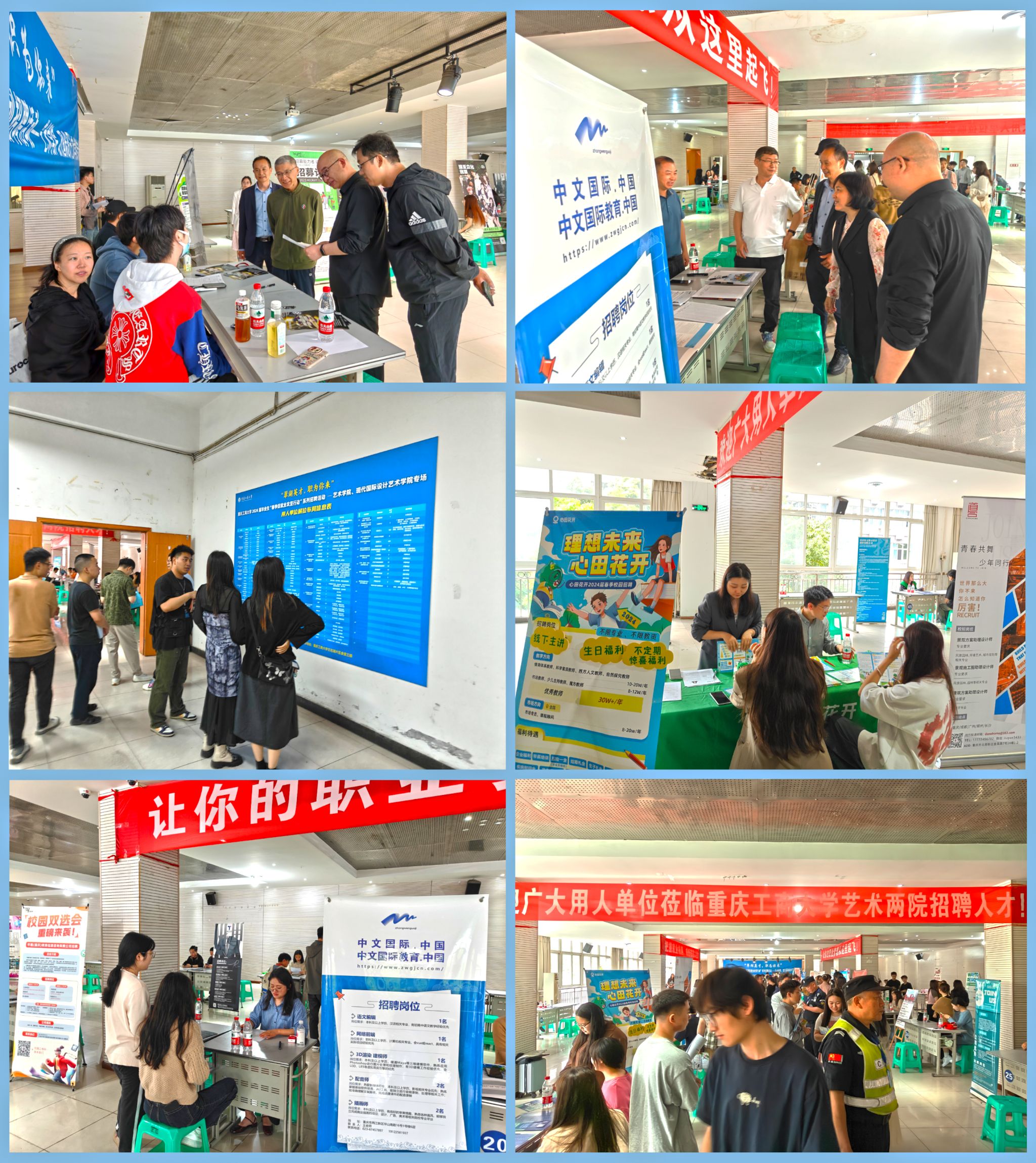 4月19日上午,艺术学院、现代国际设计艺术学院在兰花湖片区食堂三楼举办2024届毕业生“春季促就业攻坚行动”系列招聘活动(艺术专场招聘会),邀请到中文教育科技(重庆)有限公司、海南无忧娱乐有限公司重庆分公司、重庆儿童天堂摄影有限公司、北京视美精典影业有限公司、重庆帛门智能科技有限公司等45家企业来院选聘人才,提供就业岗位1800余个。