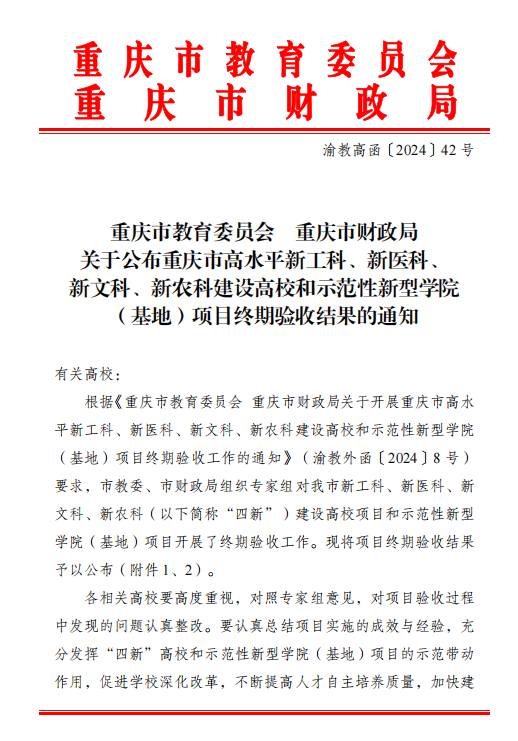 近日,《重庆市教育委员会 重庆市财政局关于开展重庆市高水平新工科、新医科、新文科、新农科建设高校和示范性新型学院(基地)项目终期验收工作的通知》(渝教外函〔2024〕8号),正式揭晓了重庆市普通本科高校基础学科人才培养示范基地的验收成果。我校经济学拔尖人才培养示范基地获“优秀”评定,顺利通过市教委验收。