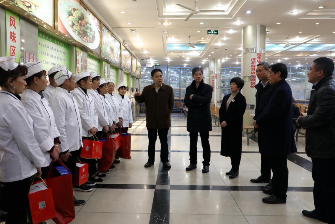 1月17日下午,学校党委书记李志雄,校长孙芳城,副校长陈兴述、李国军、宋豫先后走访了学生处办公室、北区物业、兰园食堂和保卫处,并向工作人员送去新春祝福。