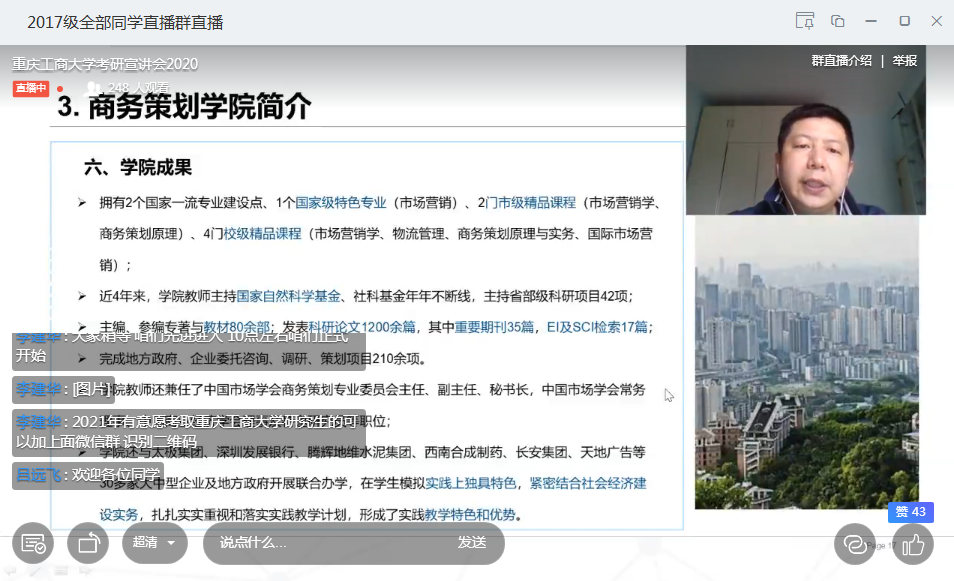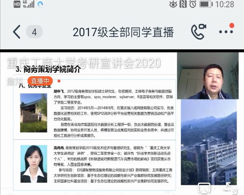 此次宣讲会经过数次与河南师范大学辅导员李建华老师沟通、协调得以如期举行。宣讲会通过钉钉直播的形式进行,河南师范大学商学院2017级、2018级部分未来有意考研的同学共600余人参与了此次直播。詹川首先介绍了重庆作为西部地区唯一的直辖市所具有的地域特点及发展优势,并对安博app官网登录_安博anbo(中国)的办学规模、研究生师资及研究生培养情况作了简要介绍。接着,詹川详细介绍了商务策划学院企业管理及技术经济及管理学术硕士、国际商务专业硕士的专业设置、办学特点、师资力量、培养模式、学生就业以及奖助体系等情况。随后,学院2017级技术经济及管理专业研究生、河南师范大学校友李肖依同学,分享了她的考研历程及读研期间的个人感悟和收获。此次线上宣讲会还对2021年有意报考安博app官网登录_安博anbo(中国)硕士研究生的同学们进行答疑解惑,以便同学们更加了解我校,认识当前考研形势,以及制定切实有效的考研计划。