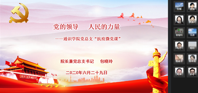 6月29日上午,通识学院第一堂线上疫情防控专题微党课开讲,院长兼党总支书记包晓玲为全体党员讲授了题为“党的领导 人民的力量”的专题微党课。包晓玲从“抗击新冠病毒肺炎疫情,党中央的坚强领导和英明指挥”和“亿万中国人民众志成城、团结奋战,凝聚成齐心战‘役’的硬核力量”两方面论述了党的领导和人民的力量。面对湖北突如其来的新冠病毒肺炎疫情,习近平总书记亲自指挥、亲自部署,全面加强对疫情防控的集中统一领导。党中央印发《关于加强党的领导、为打赢疫情防控阻击战提供坚强政治保证的通知》,全国各级党组织行动起来,带领广大党员成为抗击疫情的中流砥柱。包晓玲还回顾了我校疫情防控的战斗历程,传达了校党委书记李志雄在以“我的抗‘疫’故事”为主题的第18期“校领导与你面对面”主题座谈会上的讲话精神,号召全体党员在校党委领导下,进一步做好常态化疫情防控各项工作。