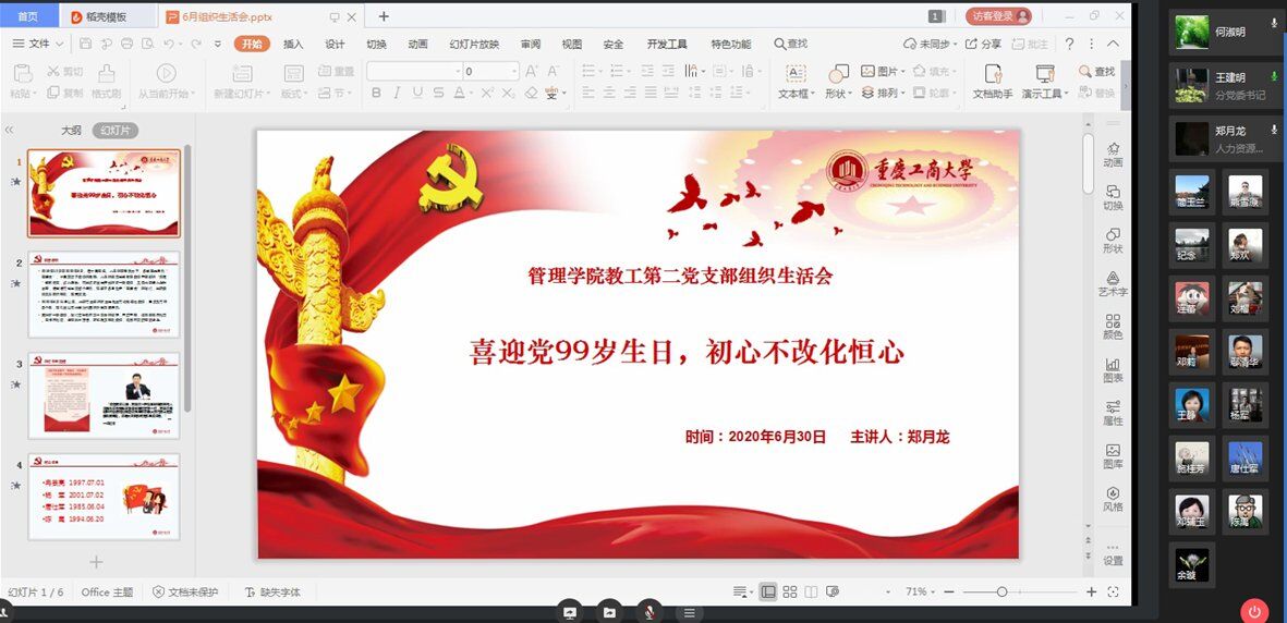 6月28日下午,商务策划学院教工党支部利用企业微信线上平台召开党员大会暨组织生活会,曾倩同志领学了“两会”精神、《习近平总书记在山西考察时的重要讲话精神》、《习近平在第73届世界卫生大会视频会议开幕式上的致辞》、《习近平给袁隆平、钟南山、叶培建等25位科技工作者代表的回信》等文件精神。支部书记唐国锋同志以“把人民群众生命安全和身体健康放在第一位”为题讲专题党课,阐述了我党“把人民健康放在优先发展战略地位思想”的硬核要义。之后,教工党员代表们以“迎党的生日、讲战疫故事、悟初心使命”为主题讲身边战“疫”故事。在建党99周年之际,大家纷纷表示了对党的祝福,回顾党的光辉历史和伟大成就,充分证明了我党是领导中国革命事业和改革建设的核心力量,尤其是在今年抗击新冠肺炎疫情的战役中,中国共产党表现出了坚定的战略定力和超强的动员力。秦星红同志家乡在湖北孝感,是此次疫情的重灾区,他生动讲述了发生在身边的真人真事。疫情爆发后全国其它省市支援湖北,当他看到重庆的医疗团队援助孝感时内心非常澎湃,重庆派出了18批医疗团队,其中800多名医疗人员留在了孝感。孝感全市各个乡镇全部实施网格化管理,村党员干部们每天挨家挨户测量体温、填报数据,非常的尽职尽责。秦星红同志主动提出帮助搜集信息,通过第三方软件实现信息填报,体现了作为基层党员的担当。