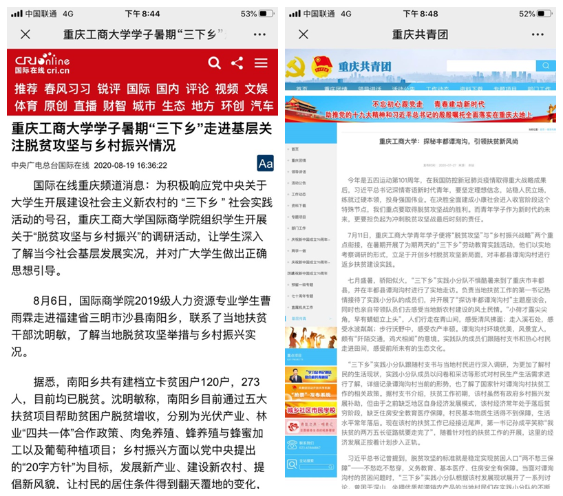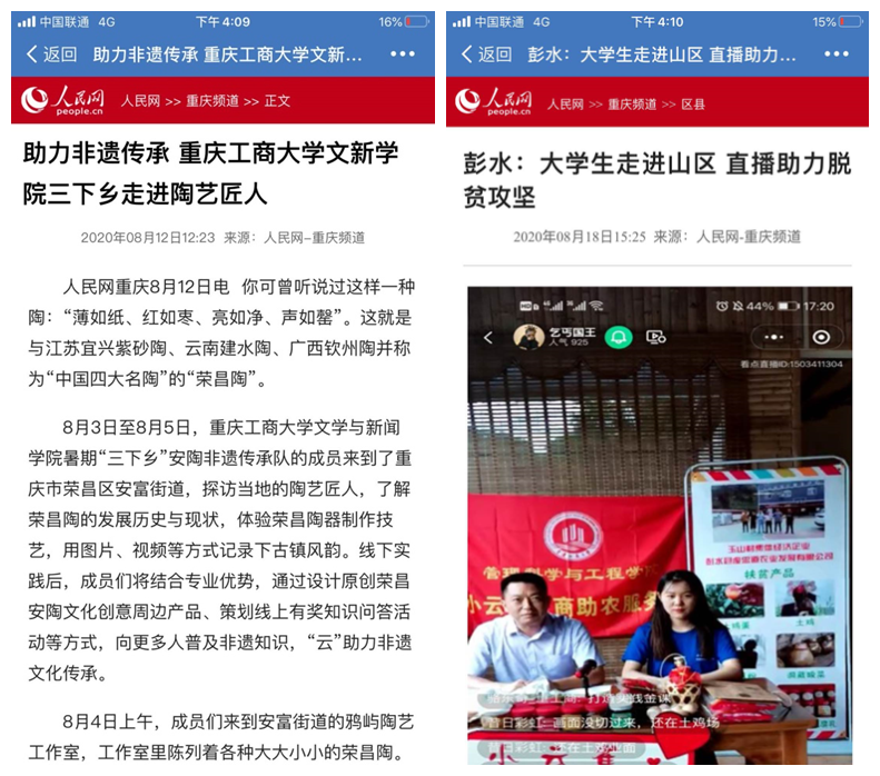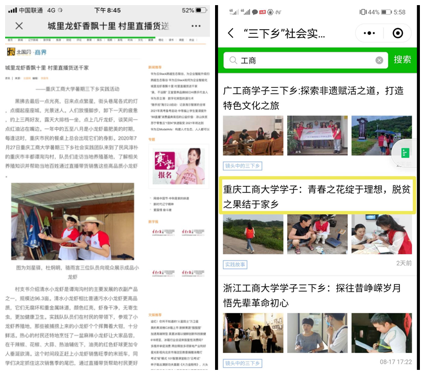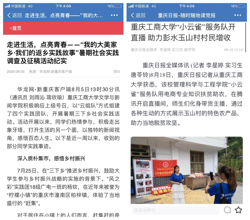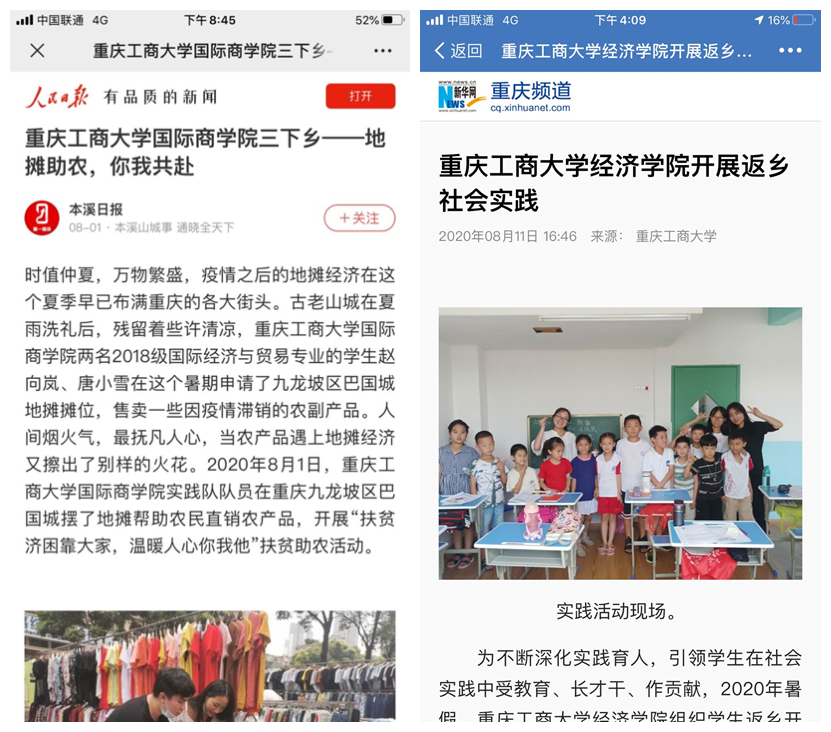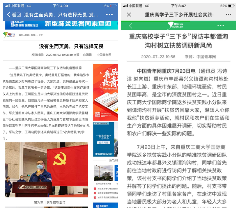 据悉,在新冠肺炎疫情防控期间,我校通过多举措、多模式、多渠道开展了“三下乡”实践活动,同时通过多平台、多角度,展示青年学生实践风采。搭建“青春工商大公众号”“团委微博”“团委网站”三维宣传平台,开设“小我融入大我 青春献给祖国”主题三下乡、“返家乡实践故事”和各学院特色创新活动展播三个专栏,积极宣传报道我校学子在学思践悟中坚定理想信念,在奋发有为中践行初心使命,充分发挥了育人实效。此次“三下乡”活动,不仅锻炼了大学生的社会服务能力,增长了他们的知识和才干,也通过社会媒体的广泛关注与报道,展现了重工商大学子用脚步丈量梦想,用青春在实践中绽放的责任感与使命感。