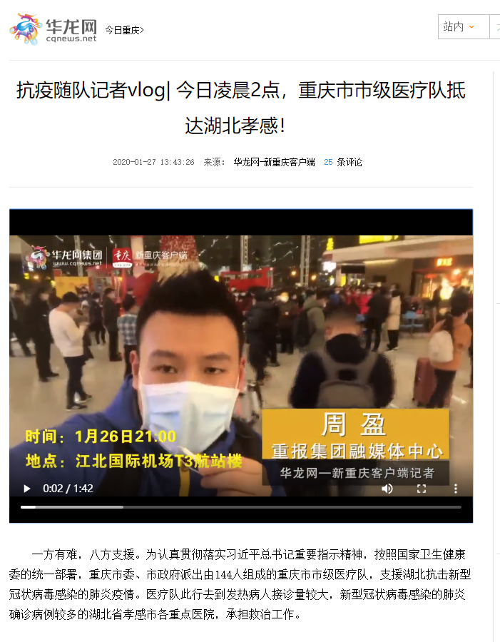 周盈是重庆华龙网集团的首席记者。疫情爆发后,周盈“欺骗”父母,说自己要值班,不能回家过年,瞒着家人前往湖北疫情一线开展采访报道工作。半个月后,父母从网上看见他从湖北发回的报道,才知道他去了抗疫一线。