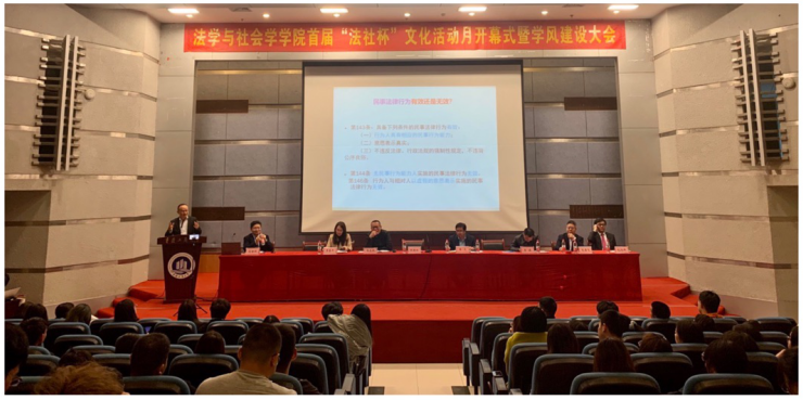 新时代、新使命、新作为,刚刚胜利召开的党的十九届五中全会为我国高等教育人才培养指引了方向。法学与社会学学院高度重视人才培养质量,不断探索和构建“三全育人”格局,在人才培养模式和途径上积极探索,多元协同,多维贯通,多层创新,努力提升育人质量。11月11日,法学与社会学学院文化活动月开幕式暨学风建设大会在博智楼7100报告厅隆重召开。副校长李国军,党委学工部部长申卫东、校团委书记杨娟,西南政法大学马登科教授、侯国跃教授、范雪飞教授、包冰峰副教授、李俊副教授,以及学院班子成员、教师代表、本硕学生代表参加了大会。会议由法学与社会学学院分党委副书记、纪委书记林璐主持。