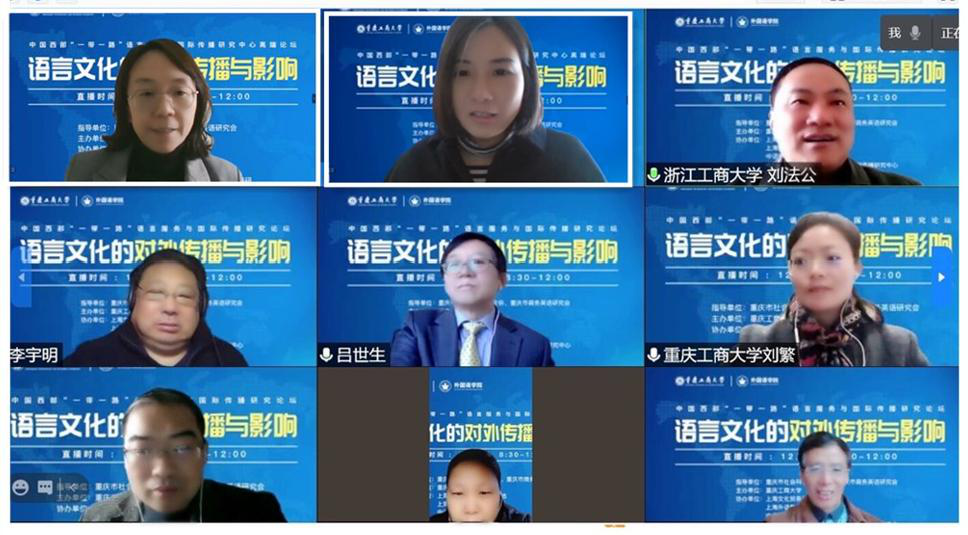 12月5日,我校在线召开“中国西部‘一带一路’语言服务与国际传播研究论坛”。本次论坛在重庆社会科学界联合会和重庆商务英语研究会的指导下,由安博app官网登录_安博anbo(中国)主办,上海文化服务贸易基地、上海外语教育出版社和中语智汇科技有限公司等单位协办。本次论坛采用学术志平台在线直播方式,我校外国语学院班子成员和教师参加了论坛,在直播平台参与本次论坛的在线人数超过3600人。外国语学院院长周琳主持论坛开幕式。