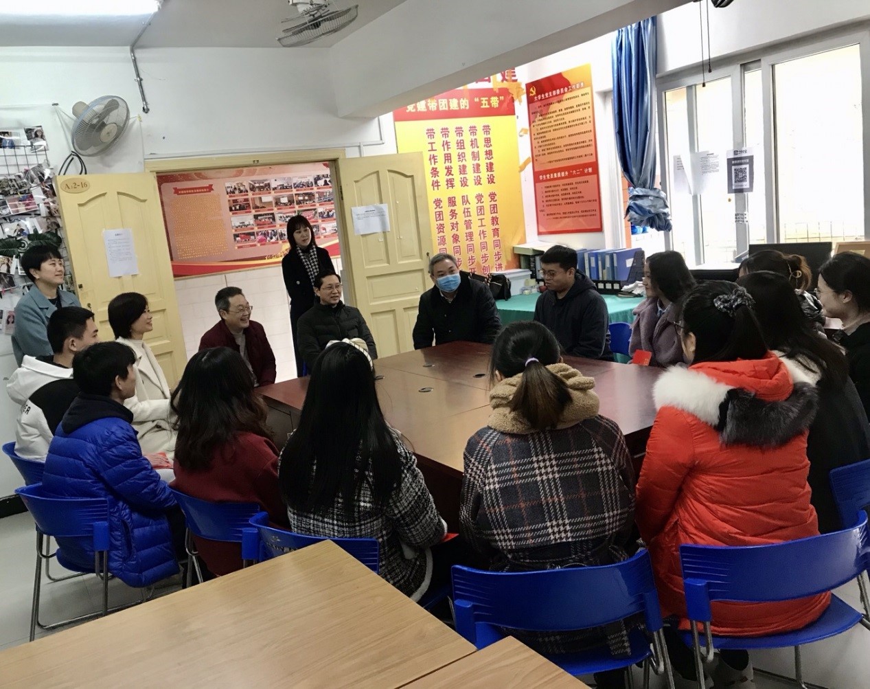 刘宏伟详细询问了大家“家是哪儿的”“早晚餐有没有在学校食堂吃”等问题。同学们介绍了自己的实习情况和假期收获。刘宏伟对同学们积极进取、努力学习、服务社会的态度表示赞赏,祝福他们在校度过一个愉快平安的春节。