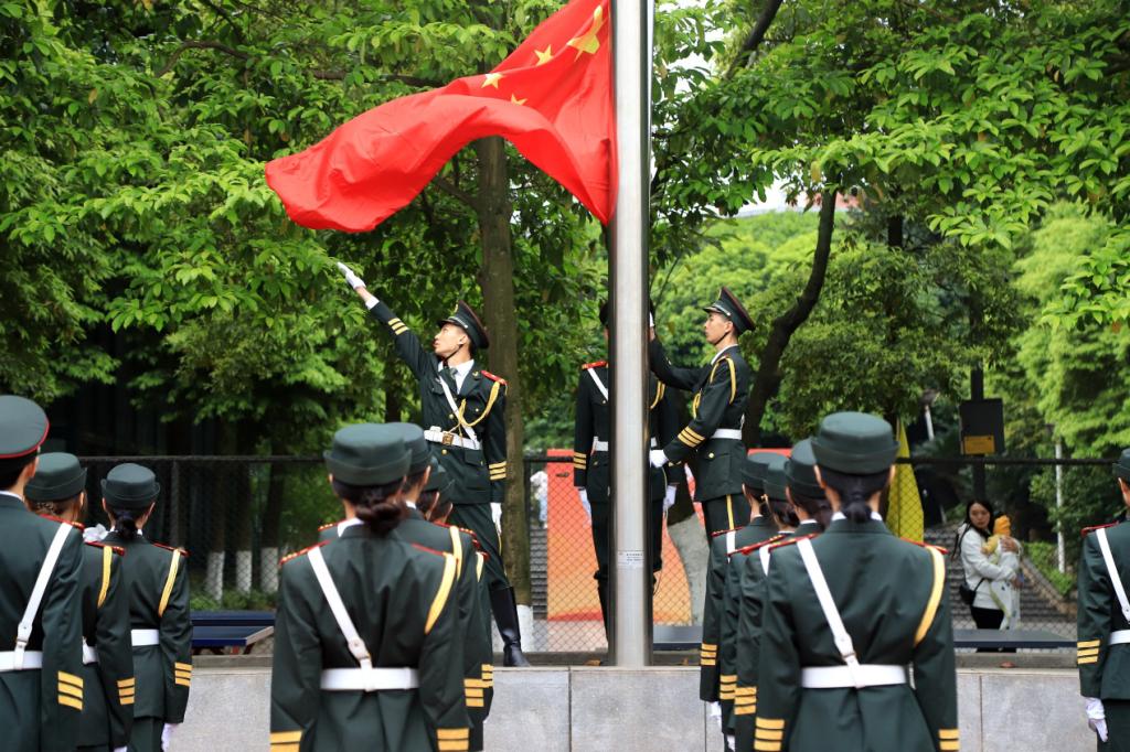 入场式上,国旗方队配合着音乐的节拍齐步行进,他们昂首挺胸,目光直视前方,展现了我校大学生的坚定信念、睿智机警。校旗、会旗、彩旗、红旗追逐着四月的微风,沐浴着春日的阳光,踏着整齐的步伐,展现着昂扬自信的精神面貌。