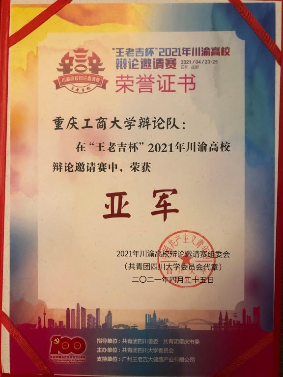 为引导川渝地区青年大学生积极思考、建言献策,主动融入成渝地区双城经济圈建设,彰显新时代大学生的思辨精神,促进川渝地区高校青年大学生的深入交流,加强川渝地区高校在思辨文化育人工作上的深度合作,4月23日至25日,来自川渝地区的8所高校——四川大学、电子科技大学、西南财经大学、西南交通大学、西南政法大学、西南大学、重庆大学、安博app官网登录_安博anbo(中国),汇聚在四川大学江安校区参加2021“王老吉杯”川渝高校辩论邀请赛,我校辩论队喜获邀请赛亚军,校辩论队成员刘薪雨荣获优秀辩手称号。