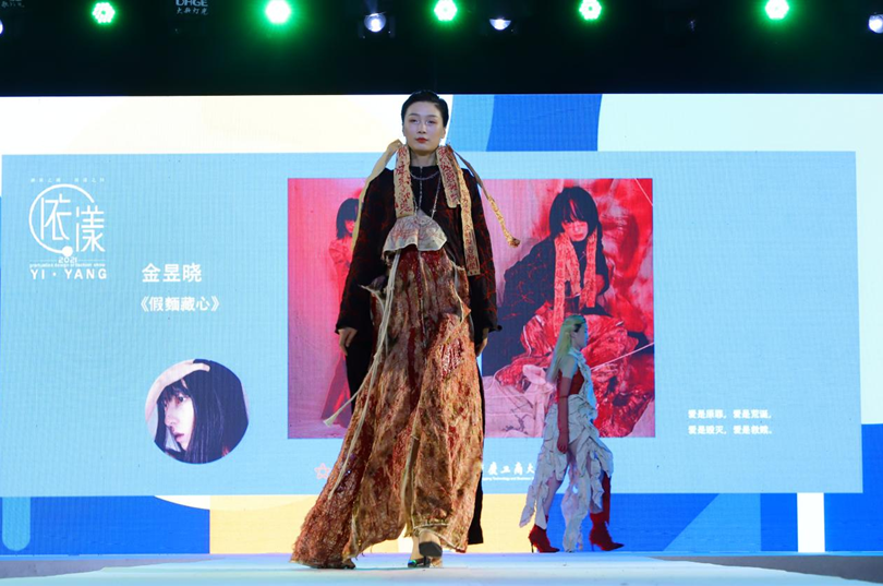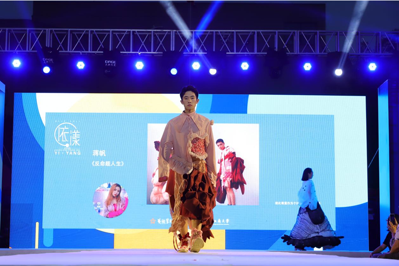 华灯璀璨,霓裳丽影。随着主持人宣布开场,模特们依次登台,动态展示了艺术学院与现代国际设计艺术学院2021届毕业学子170余件优秀毕业作品。本次服装秀分为上下两场,主题为“依.漾”。艺术学院与现代国际设计艺术学院的学子们以其前卫的审美、独特的视角,从结构、色彩、面料等多个层面进行精心设计、打版制作,将时尚、流行、自然、民族传统等多种元素融入设计之中,表现出了独特、创意、风格多元的设计理念。学子们在一针一线中注入了匠心之魂,将创意的灵感赋予在作品中,独立思考、协同合作,达到美育育人的效果。