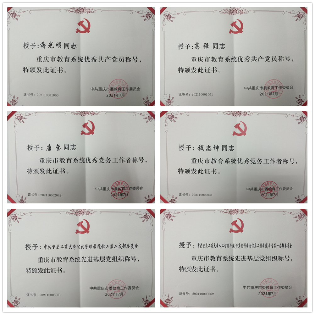 近日,重庆市、重庆市教育系统分别公布“两优一先”表彰对象名单。我校有1人获评重庆市优秀共产党员,2人获评重庆市教育系统优秀共产党员,2人获评重庆市教育系统优秀党务工作者,2个基层党组织获评重庆市教育系统先进基层党组织。名单如下: