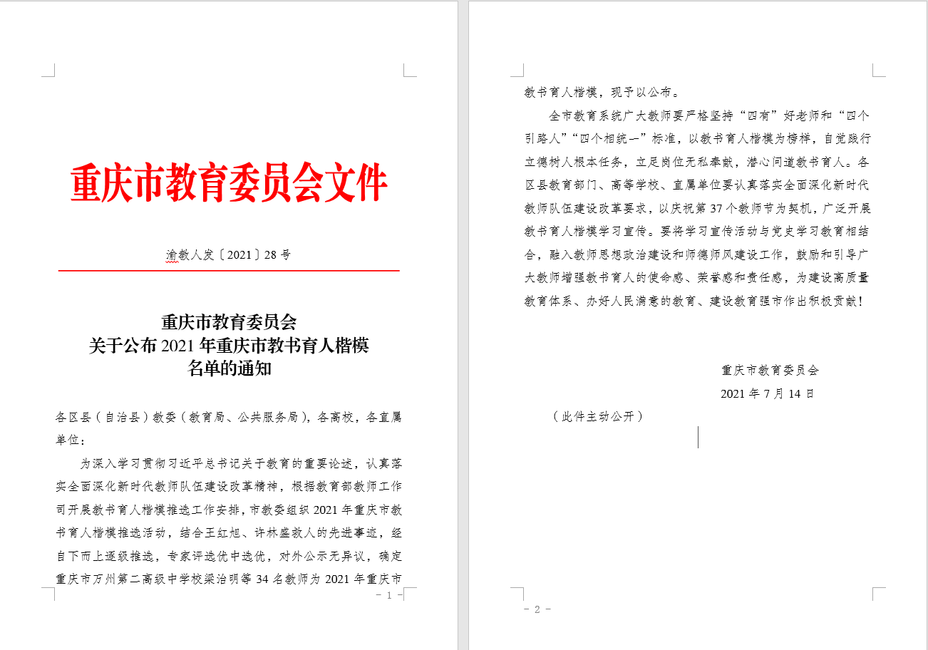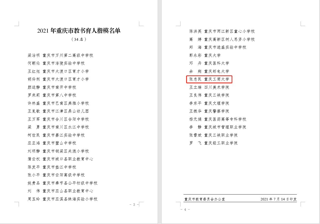为深入学习贯彻习近平总书记关于教育的重要论述,认真落实全面深化新时代教师队伍建设改革精神,市教委组织开展了2021年重庆市教书育人楷模推选活动,我校法学与社会学学院教师张忠民获评2021年重庆市教书育人楷模,全市共34名教师获得此项荣誉称号。