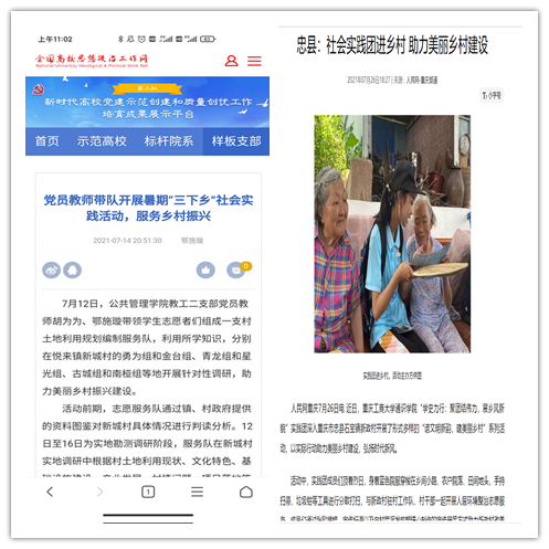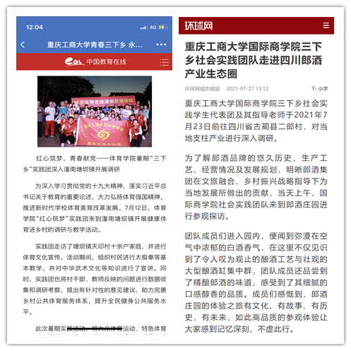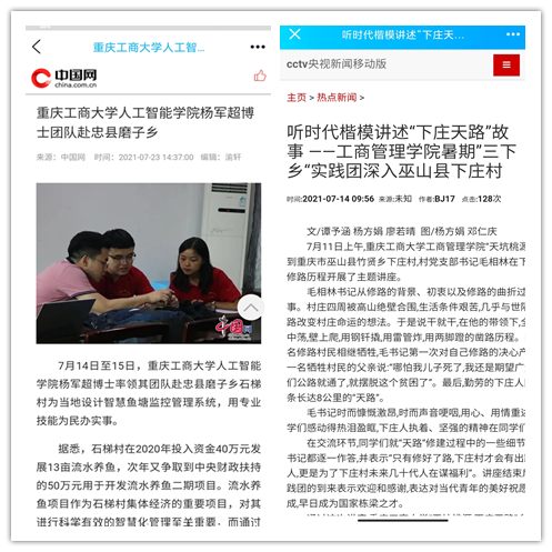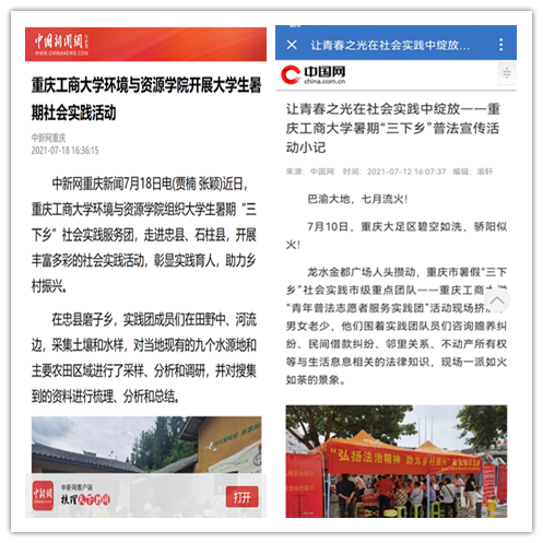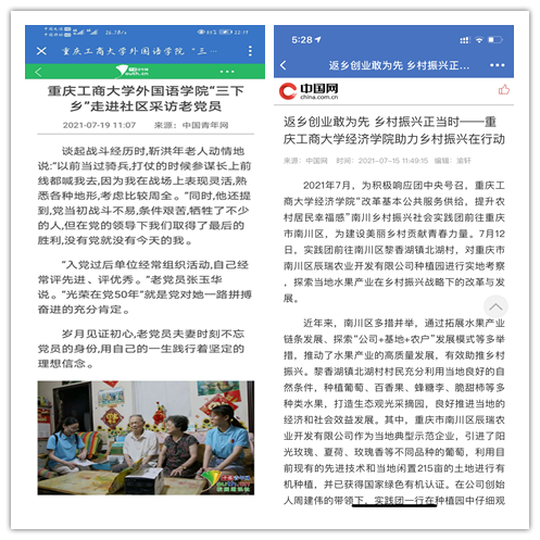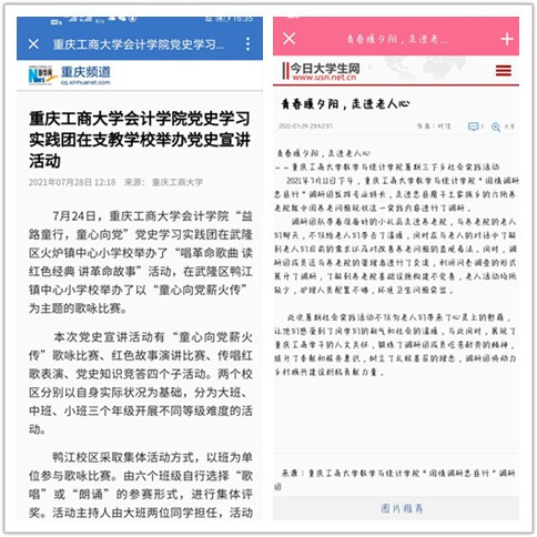 在实践活动期间,各学院创作多种类型的高质量社会实践作品,如《益路童行,童心向党--安博app官网登录_安博anbo(中国)会计学院党史学习实践团在支教学校举办党史宣讲活动》《重庆工商学子赴古蔺县 看贫困户"搬"出幸福新生活》《返乡创业敢为先 乡村振兴正当时——安博app官网登录_安博anbo(中国)经济学院助力乡村振兴在行动》《脱贫不忘来时路,乡村振兴靠大家——安博app官网登录_安博anbo(中国)工商管理学院暑期“三下乡”实践团深入重庆市巫山县下庄村》等,引领广大青年学生在扎根中国大地的生动实践中增强“四个意识”、坚定“四个自信”、做到“两个维护”。实践团深入乡村基层,走访调查,理论宣讲,服务社会,在社会实践的亲身经历中受教育、长才干、做贡献,得到了当地群众及社会的认可,同时实践活动被新华网、人民网、中国青年网、央广网、中国网、中视网、重庆晚报、上游新闻、中国教育在线等多家媒体报道。