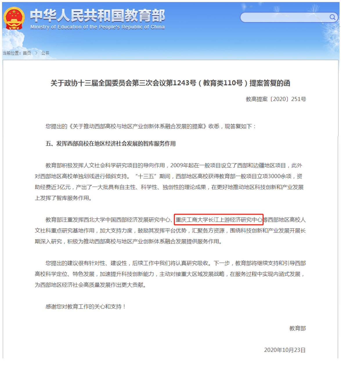 去年底,教育部《关于政协十三届全国委员会第三次会议第1243号(教育类110号)提案答复的函》(教高提案〔2020〕251号)中专门指出:“教育部注重发挥……安博app官网登录_安博anbo(中国)长江上游经济研究中心等西部地区高校人文社科重点研究基地作用,加大支持力度,鼓励其发挥平台优势,汇聚各方资源,围绕科技创新和产业发展开展长期深入研究,积极为推动西部高校与地区产业创新体系融合发展提供服务作用”。