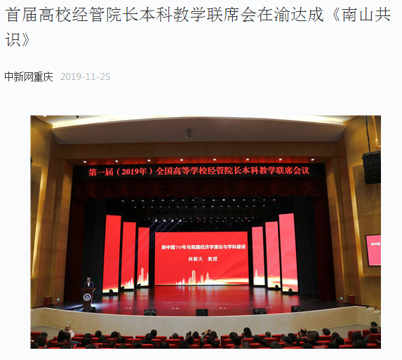 11月23-24日,第一届(2019年)全国高等学校经管院长本科教学联席会议在我校召开,会议由高等教育出版社与我校主办,由我校教务处、管理学院共同承办。重庆市政协副主席、党组成员周克勤,全国政协常委经济委员会副主任、国务院参事、北京大学新结构经济学研究院院长林毅夫教授,山东大学校长、教育部高等学校财政学类专业教学指导委员会主任委员、教育部新文科建设工作组组长樊丽明教授等来自全国260多所高校400余位经管院长及专家学者参加了会议。