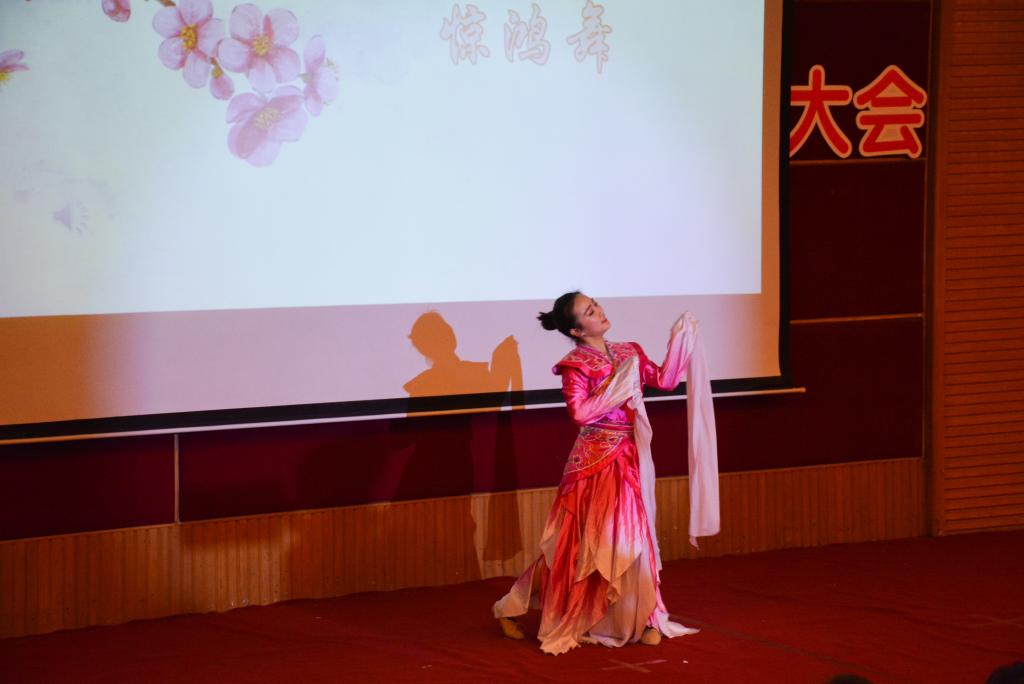 朗诵间隙,校大学生艺术团舞蹈分团成员、2016级商务英语专业的刘婷娴同学带来《惊鸿舞》,古典的音乐、柔美的舞姿把观众拉到了古风古韵的诗词世界。受《中国诗词大会》启发,译读大会现场还设置了精彩绝伦的“飞花令”环节,随机邀请现场同学两两一组“斗诗”,分别以“春”、“雨”、“花”为主题进行了三轮比拼,每组选手进行了至少六轮的PK,许多生僻的诗句他们都信手拈来,让人赞叹,对诗过程酣畅淋漓,现场观众拍手称快。译读大会还专门设置了向首位获国际翻译界最高奖项之一的“北极光”杰出文学翻译奖的亚洲人许渊冲老先生致敬的环节,两位同学声情并茂地朗读了毛泽东主席的作品《沁园春.雪》和许渊冲老先生的同名翻译作品,气势磅礴、震撼人心。