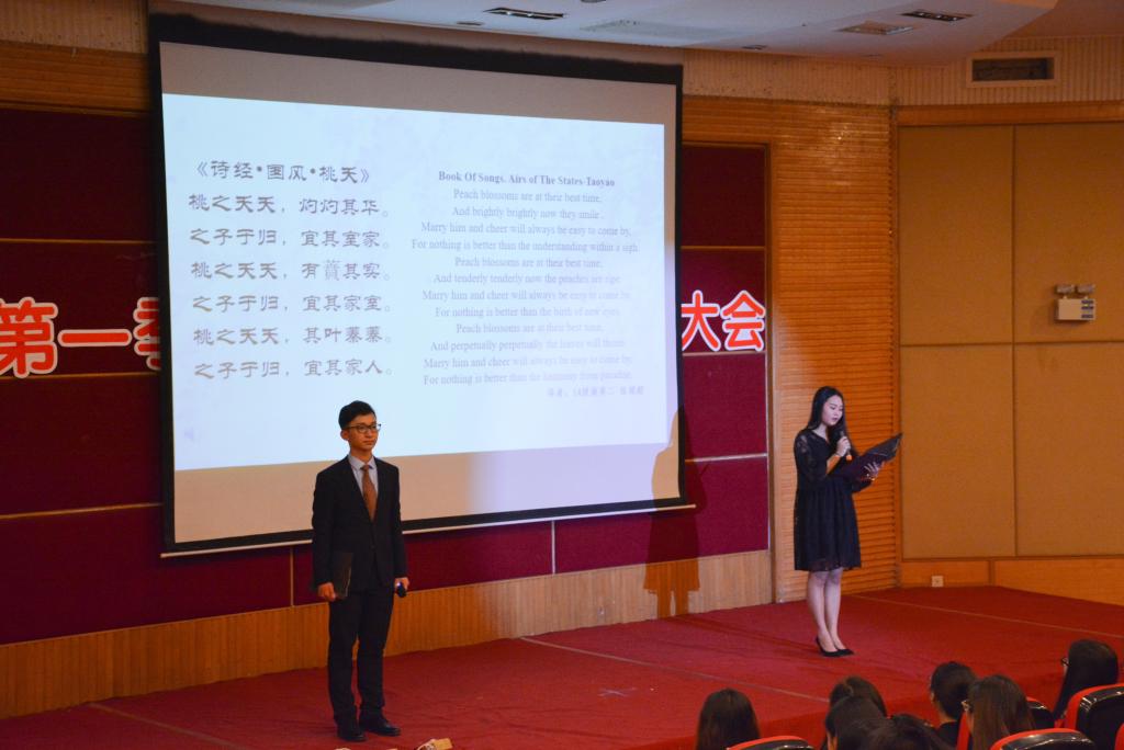 时逢谷雨时节,译读大会在清代诗人、画家郑板桥“几枝新叶萧萧竹,数笔横皴淡淡波。正好清明连谷雨,一杯香茗坐其间” 的中英诗句中拉开序幕。同学们纷纷化身“朗读者”,为现场观众带来了中国经典诗词的中英文译读。李延年的《李延年歌》、王昌龄的《闺怨》、崔护的《题都城南庄》、贺知章的《咏柳》、《诗经•国风•桃夭》、顾城的《小巷》、毛泽东的《卜算子.咏梅》、王昌龄的《闺怨》等八篇经典古诗词中的名句被翻译成优美的英文,这些最熟悉、最打动人心的诗词,精彩独到的翻译,激发了现场观众共同的记忆与情怀,带领大家在“世界语言”中领会中国诗词的唯美。
