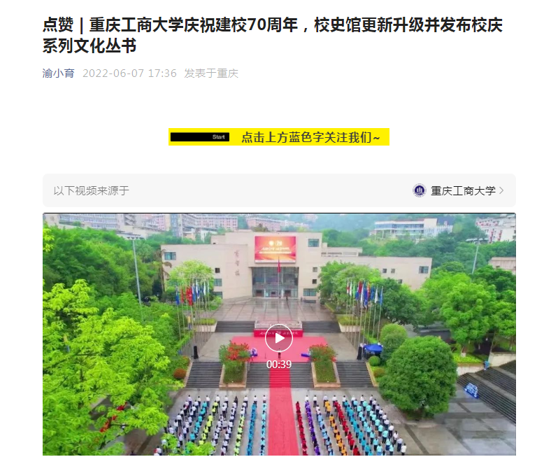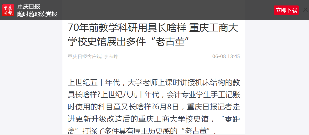 近日,重庆日报、华龙网等媒体报道我校庆祝建校70周年系列活动。6月7日,重庆日报微信公众号“渝小育”以“点赞 | 安博app官网登录_安博anbo(中国)庆祝建校70周年,校史馆更新升级并发布校庆系列文化丛书”为题报道我校建校70周年升国旗仪式和校史馆更新升级开馆。6月7日,华龙网-新重庆客户端以“安博app官网登录_安博anbo(中国)庆祝建校70周年升国旗仪式隆重举行”为题报道我校建校70周年升国旗仪式。6月8日,重庆日报客户端以“70年前教学科研用具长啥样 安博app官网登录_安博anbo(中国)校史馆展出多件‘老古董’”为题报道我校校史馆更新升级。