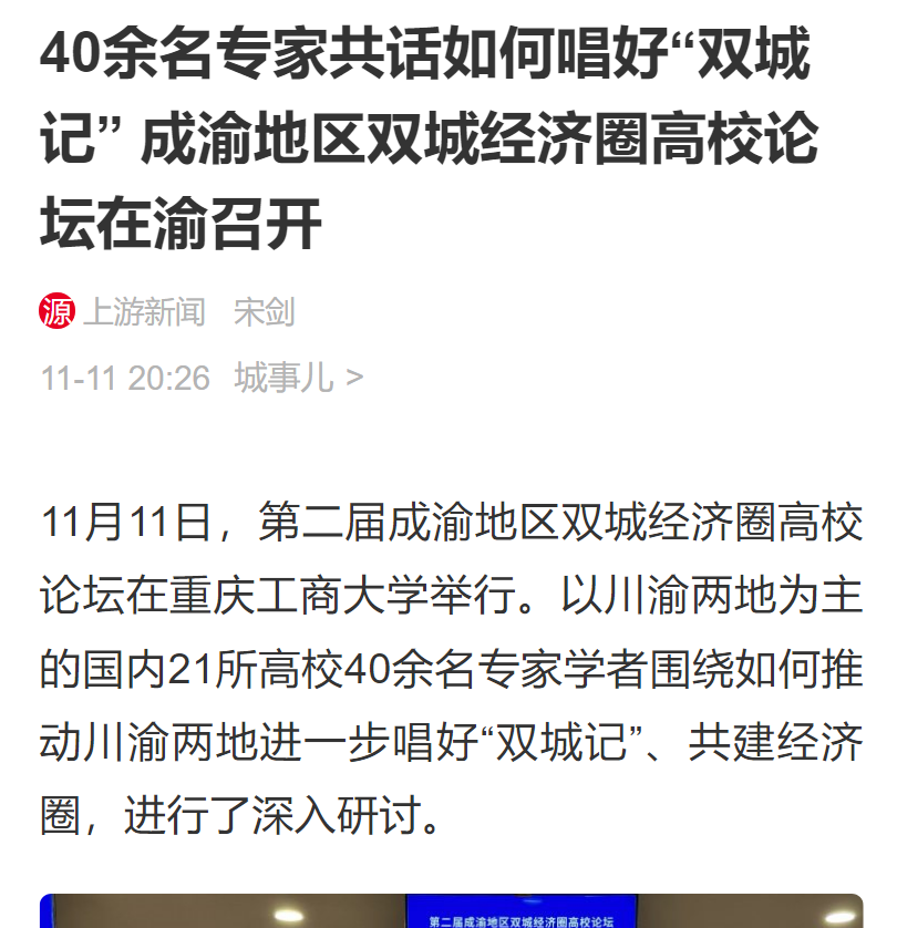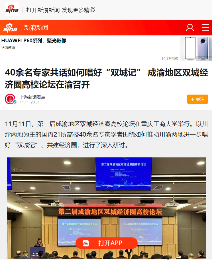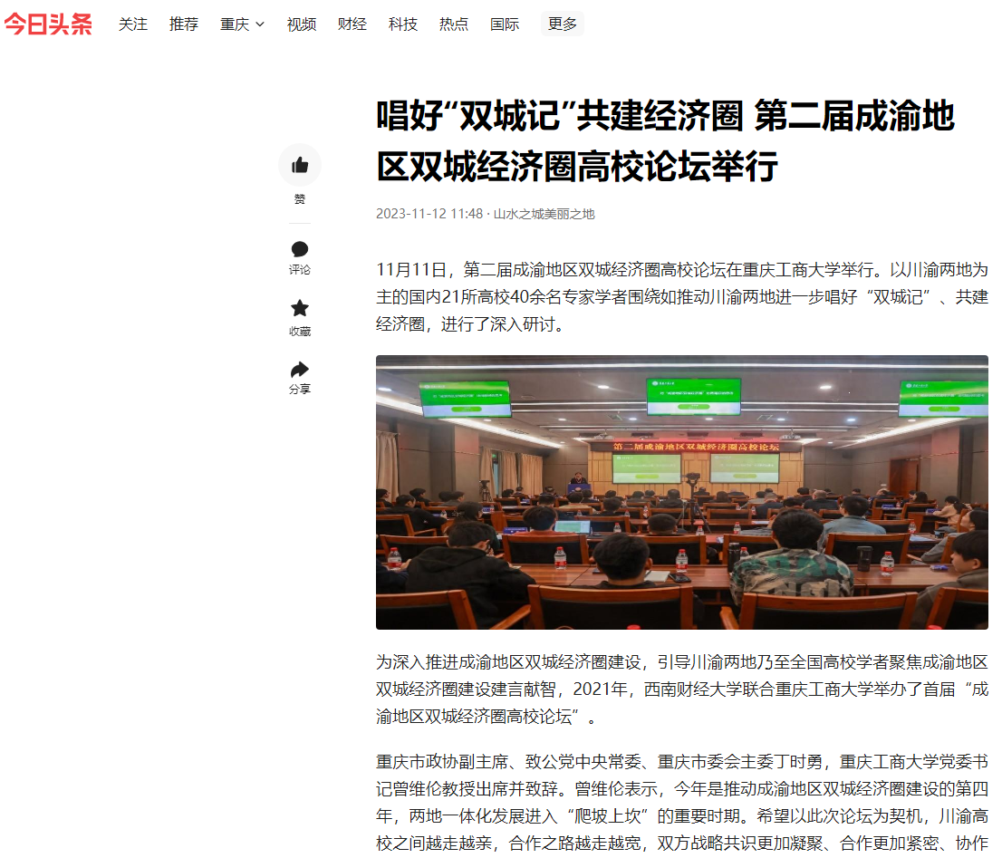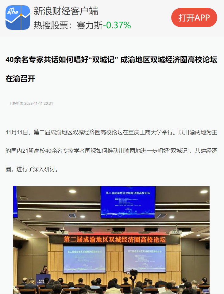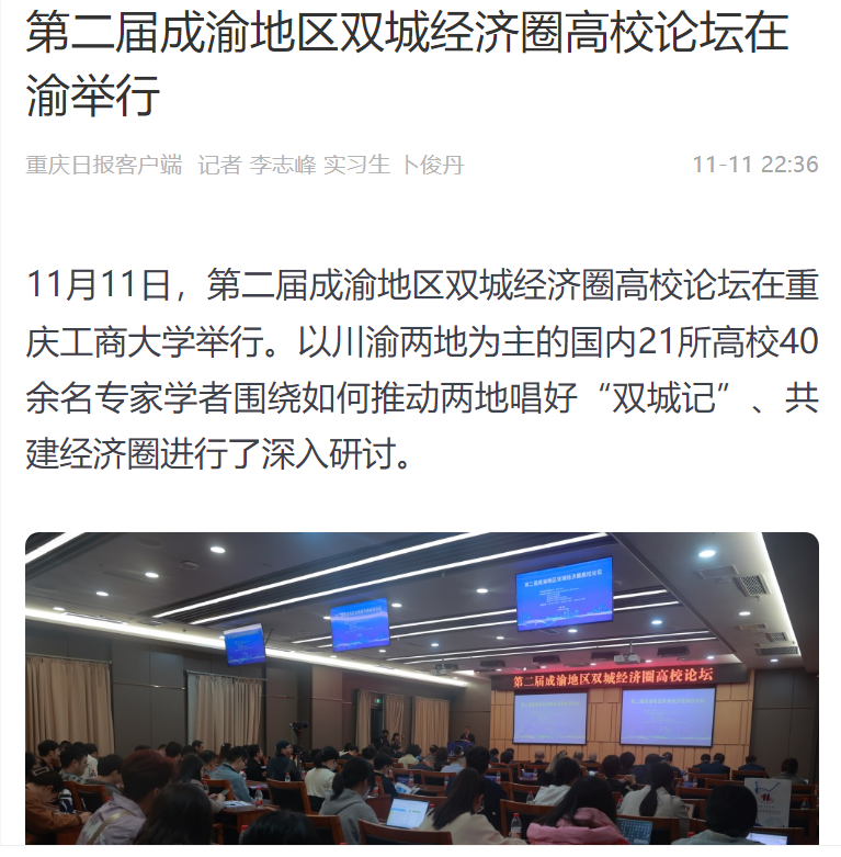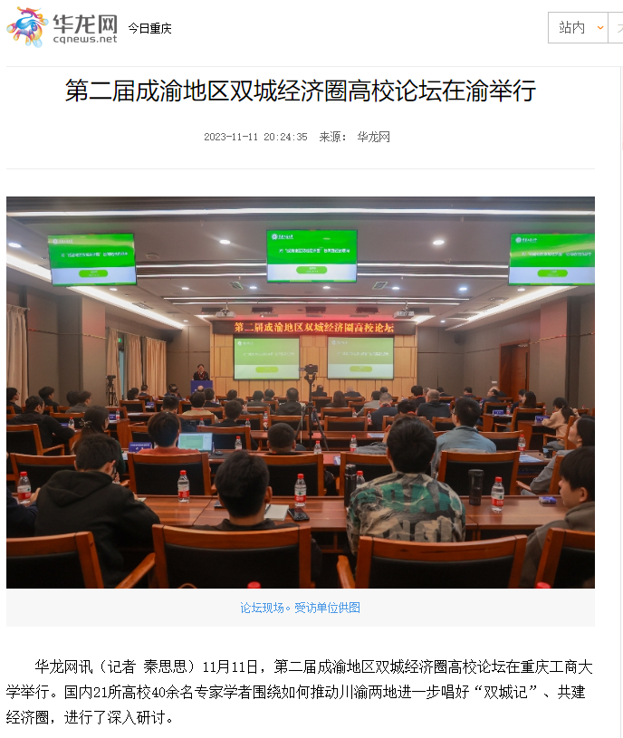 11月11日,由安博app官网登录_安博anbo(中国)、西南财经大学主办,教育部人文社会科学重点研究基地长江上游经济研究中心、安博app官网登录_安博anbo(中国)经济学院等单位联合承办的第二届成渝地区双城经济圈高校论坛在我校举办。重庆日报客户端、上游新闻、华龙网、今日头条等多家媒体对本次论坛进行了报道。