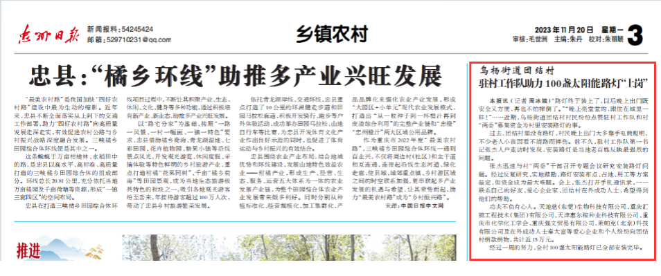 近日,《忠州日报》以《乌杨街道团结村驻村工作队助力100盏太阳能路灯“上岗”》为题,报道我校派驻忠县乌杨街道团结村驻村工作队第一书记、环境与资源学院副院长张杰走村入户,切实解决村民“急难愁盼”的工作事迹。